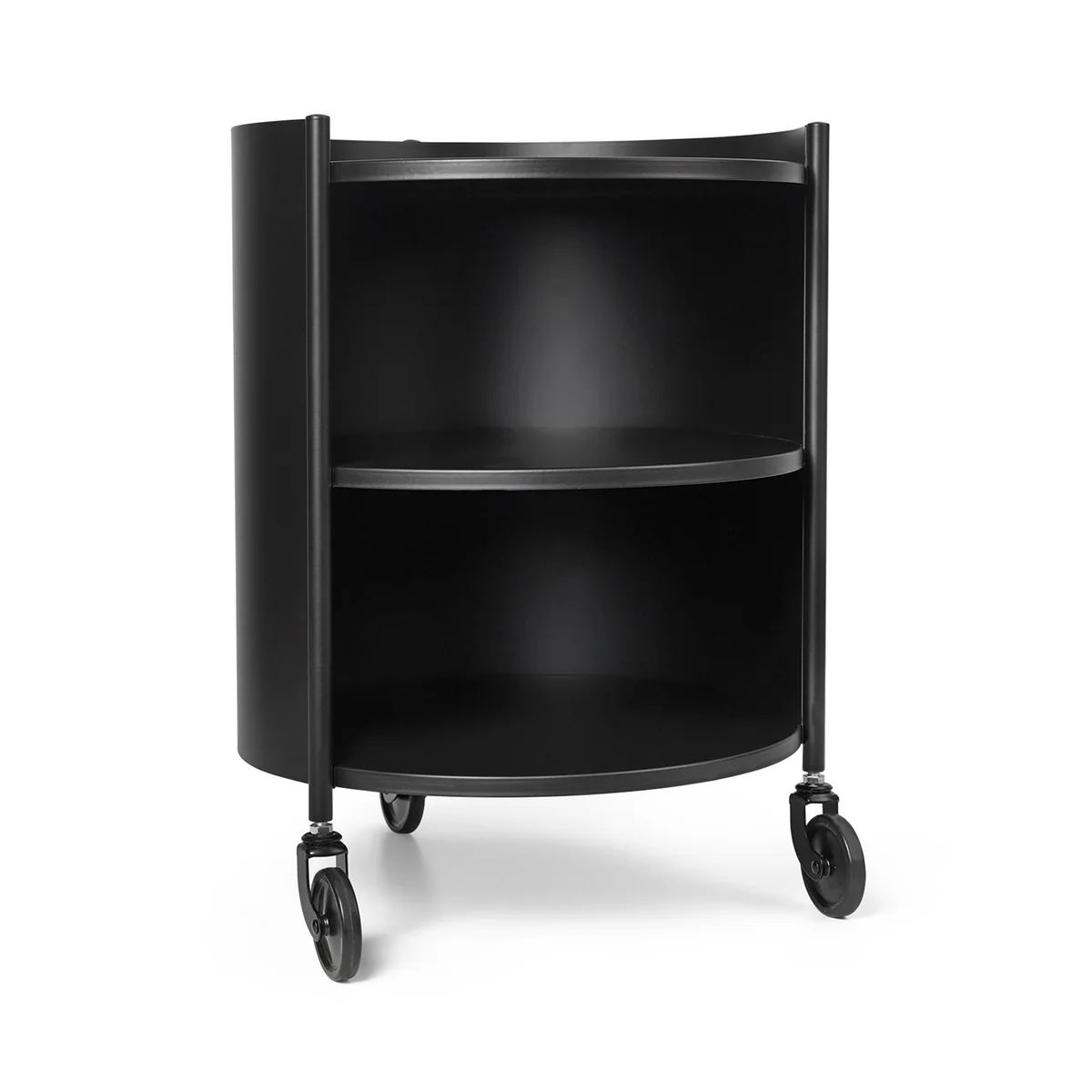 Eve Storage is een veelzijdig meubel van robuust, gepoedercoat staal met drie planken, waarvan er twee gedeeltelijk verborgen zijn achter het slanke frame, dat een aantrekkelijke cilindrische vorm en drie grote wielen heeft. Plaats een tafellamp op de bovenste plank en gebruik de Eve Storage als praktisch nachtkastje, gebruik hem in de woonkamer als stijlvolle bijzettafel of op kantoor om uw belangrijkste spullen op te bergen. Dankzij de functionele wielen Eve Storage kan comfortabel van de ene naar de andere kamer worden verplaatst en voldoet zo aan al uw opbergbehoeften.