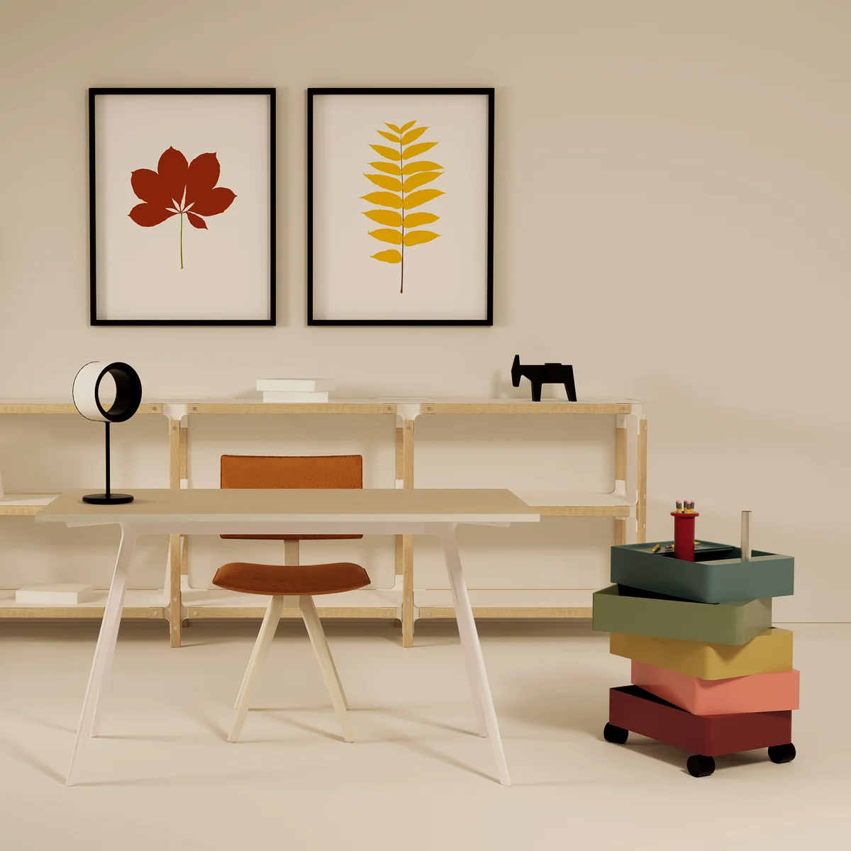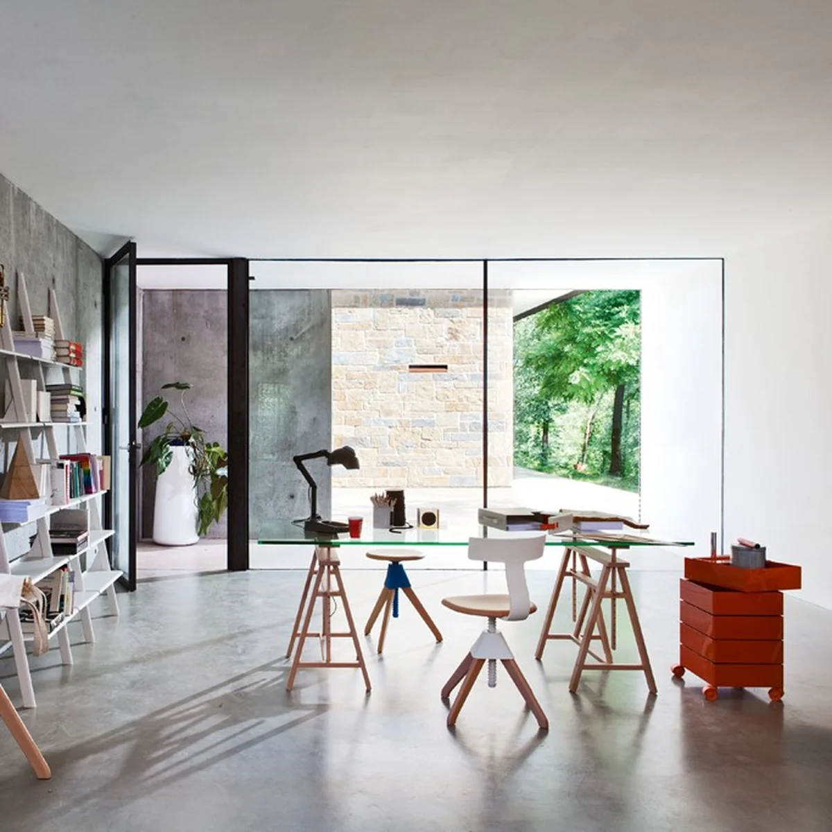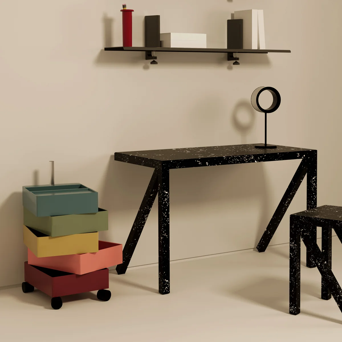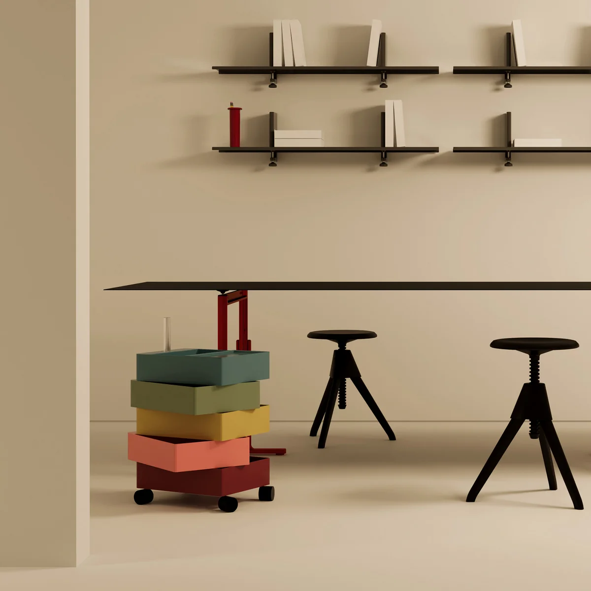 Konstantin Grcic heeft de glanzende materialen ingebed in een eenvoudig ontwerp dat zowel op zichzelf als samen met de bijpassende stoel 360° indrukwekkend is. Afhankelijk van de behoeften biedt Magis de 360° container aan in twee hoogtes en verschillende kleuren. Er is ook een extra plateau verkrijgbaar om het bovenste schap af te dekken.