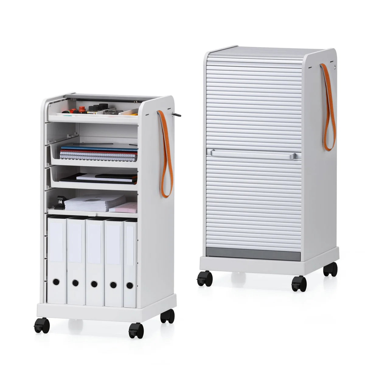 De wagen Follow Me is een robuuste trolley - zowel voor op kantoor als voor thuisgebruik. In het onderste compartiment kunnen meerdere mappen worden bewaard en in het opbergvak erboven is ruimte voor pennen, documenten en persoonlijke spullen. U kunt de trolley optioneel aanpassen met pennenbakjes, laden en planken die kunnen worden toegevoegd om hem aan te passen aan uw individuele behoeften. De afsluitbare roldeur laat indien nodig alles verdwijnen.