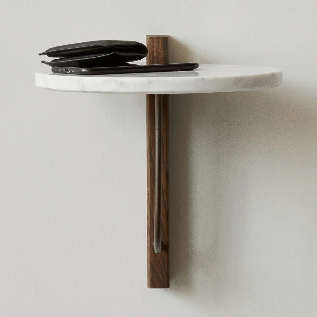 De modernistische Corbel wandplank van Audo is een podium dat aan de muur hangt en contrasterende materialen combineert met een opvallend effect.