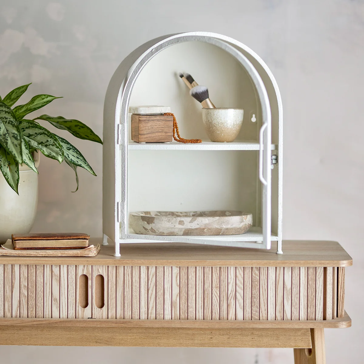 De Soria kast van Bloomingville maakt indruk met zijn moderne, minimalistische ontwerp. Hij is gemaakt van wit gelakt metaal en maakt indruk met zijn zachte ronde vormen en verhoogde poten, die lichtheid en elegantie toevoegen aan de kamer. De strakke lijnen en neutrale kleurstelling maken de kast veelzijdig - in de keuken voor serviesgoed, in de gang voor alledaagse spullen of in het thuiskantoor voor stijlvolle opbergruimte. De robuuste metalen structuur en het onderhoudsvriendelijke oppervlak garanderen duurzaamheid en functionaliteit.