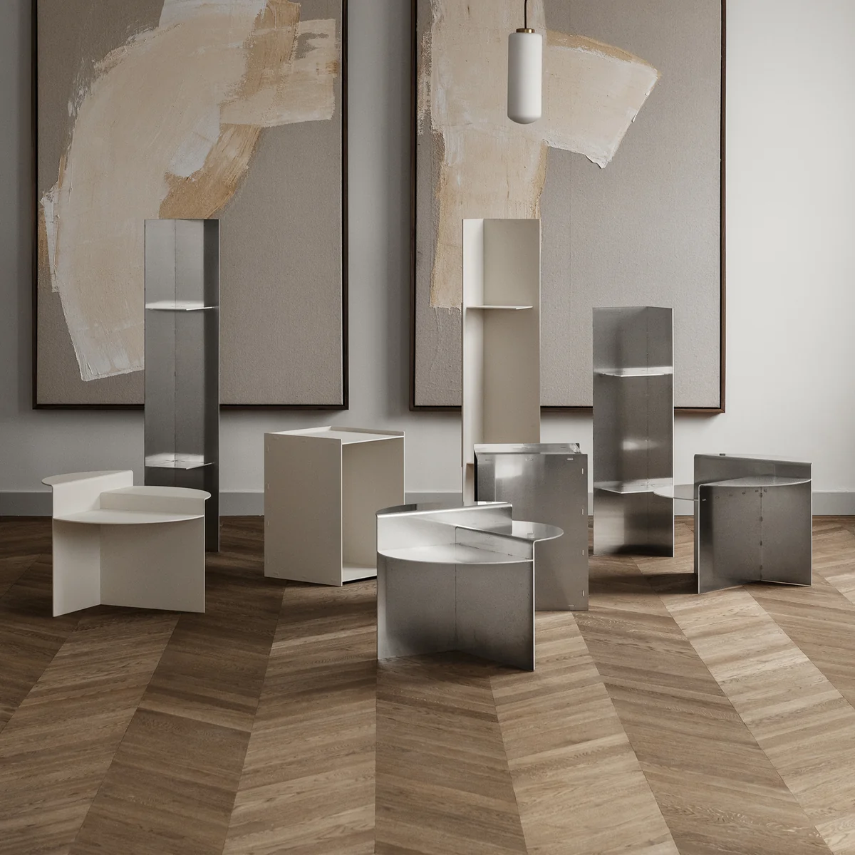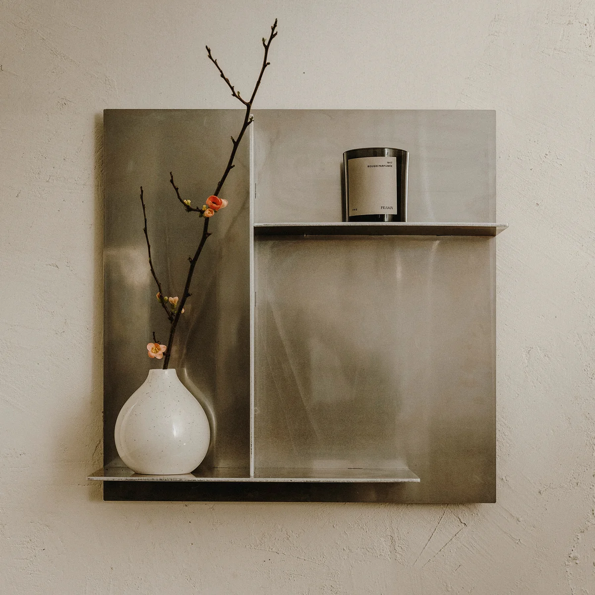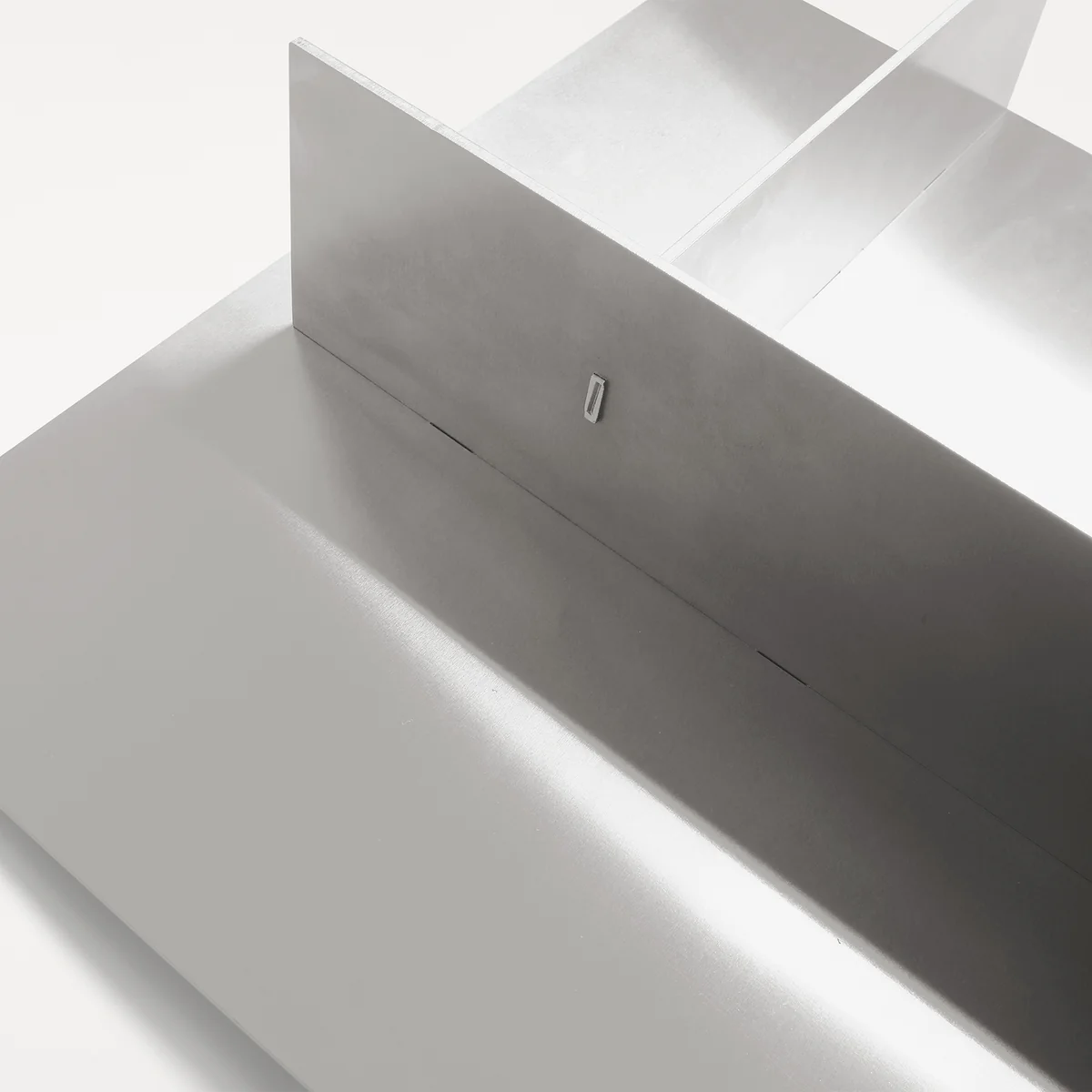 De Rivet Typecase wandplank van Frama is gemaakt van aluminium. Het materiaal, dat moeilijk te bewerken is voor meubels, wordt op traditionele wijze uitgesneden en met de hand gehamerd. Het ruwe, onbehandelde oppervlak is een eerbetoon aan het industriële karakter van het materiaal.