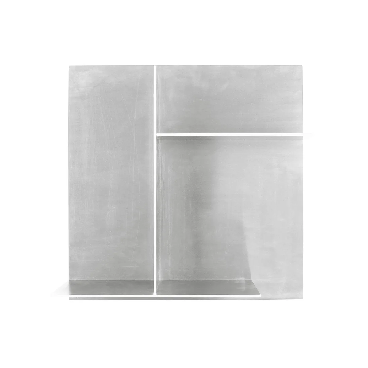 De Rivet Typecase wandplank van Frama is gemaakt van aluminium. Het materiaal, dat moeilijk te bewerken is voor meubels, wordt op traditionele wijze uitgesneden en met de hand gehamerd. Het ruwe, onbehandelde oppervlak is een eerbetoon aan het industriële karakter van het materiaal.
