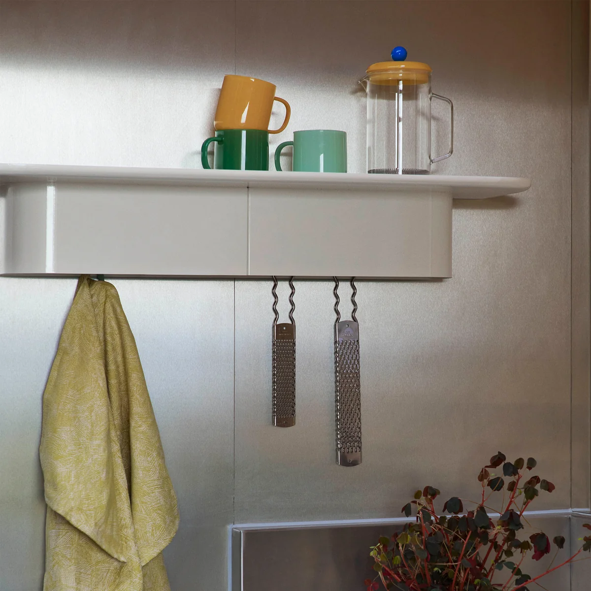 De Korpus wandplank met kapstokhaken van Andreas Bergsaker voor HAY inspireert door zijn kleurigheid. Tegen de achtergrond van de ontwikkeling van een multifunctionele plank van recycleerbare materialen, heeft de Korpus wandplank is gemaakt van aluminium plaat. De voordelen: Hij is licht, duurzaam en kan ontelbare keren worden hergebruikt. Het aluminium krijgt zijn kenmerkende gebogen vorm door middel van een industrieel reliëf- en stansprocédé. Aan de achterkant van de plank bevinden zich sleuven voor sleutelgaten, waardoor het gemakkelijker is om het geheel te bevestigen. De haken zijn binnenin weggewerkt, maar bieden extra mogelijkheden voor het ophangen van jassen, tassen en co.