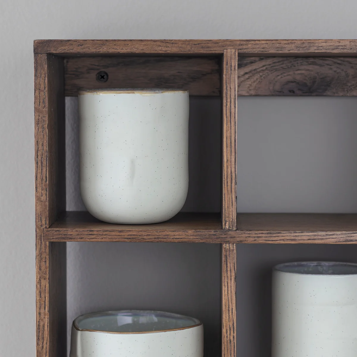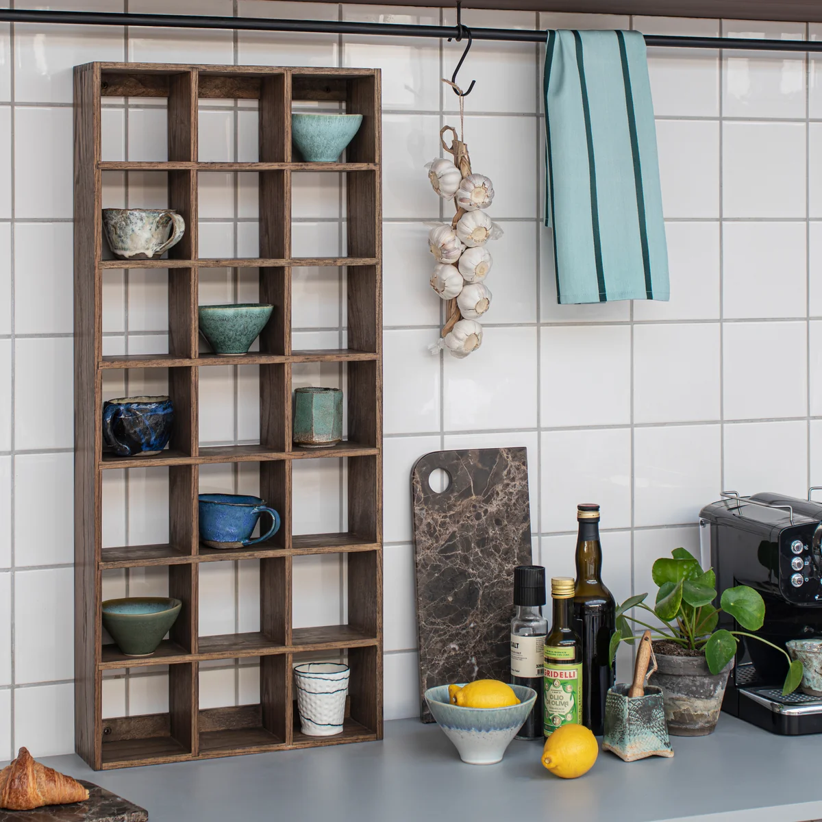 De Showcase wandplank is gemaakt van donker eikenhout, wat niet alleen een warme sfeer creëert, maar ook robuustheid en duurzaamheid garandeert. De zorgvuldige afwerking benadrukt de natuurlijke schoonheid van het hout.