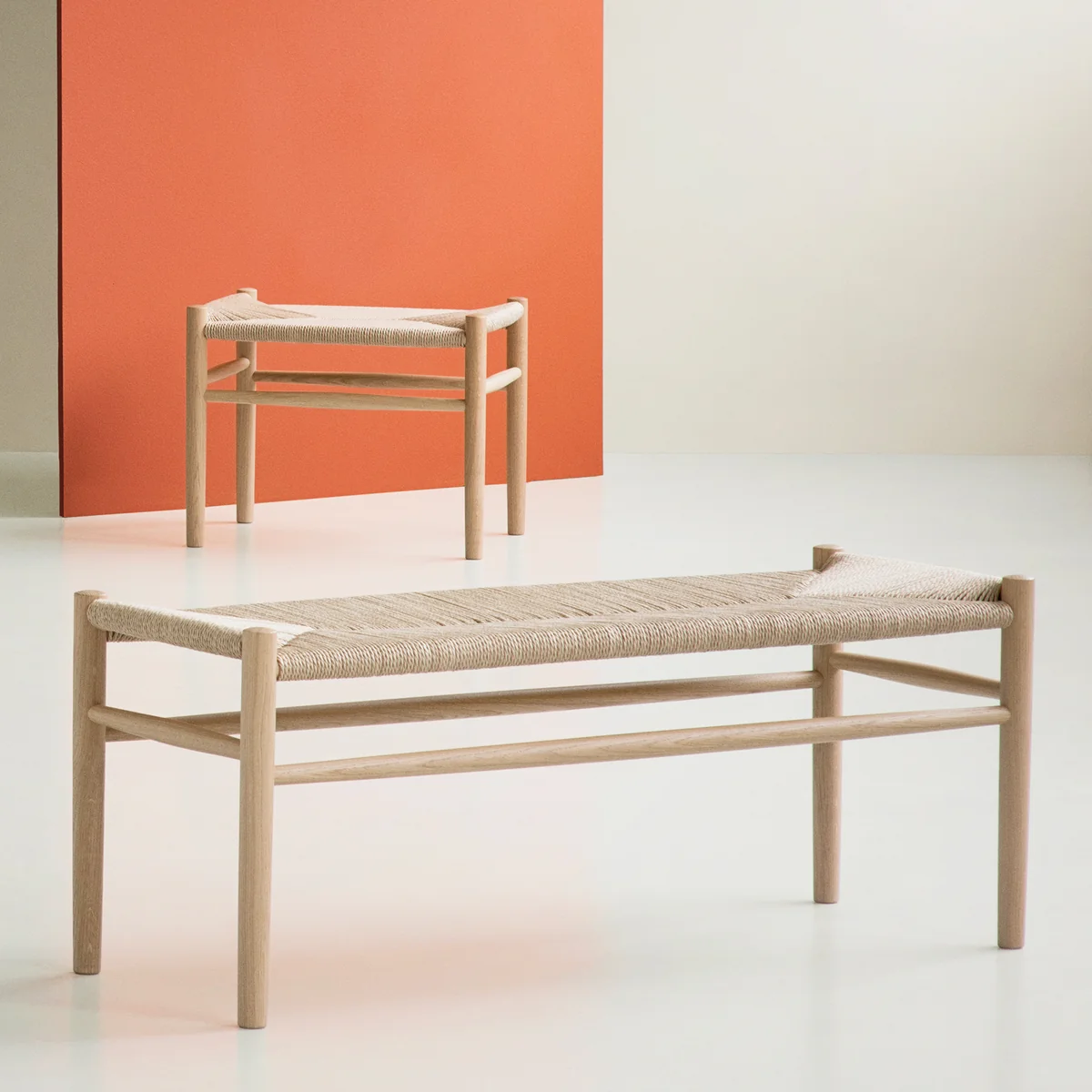De J83B bank is gemaakt van massief FSC®-gecertificeerd eikenhout en is afkomstig uit Europese bossen. De zitting bestaat uit een natuurlijk vlechtwerk en voegt gezelligheid toe aan het ontwerp.