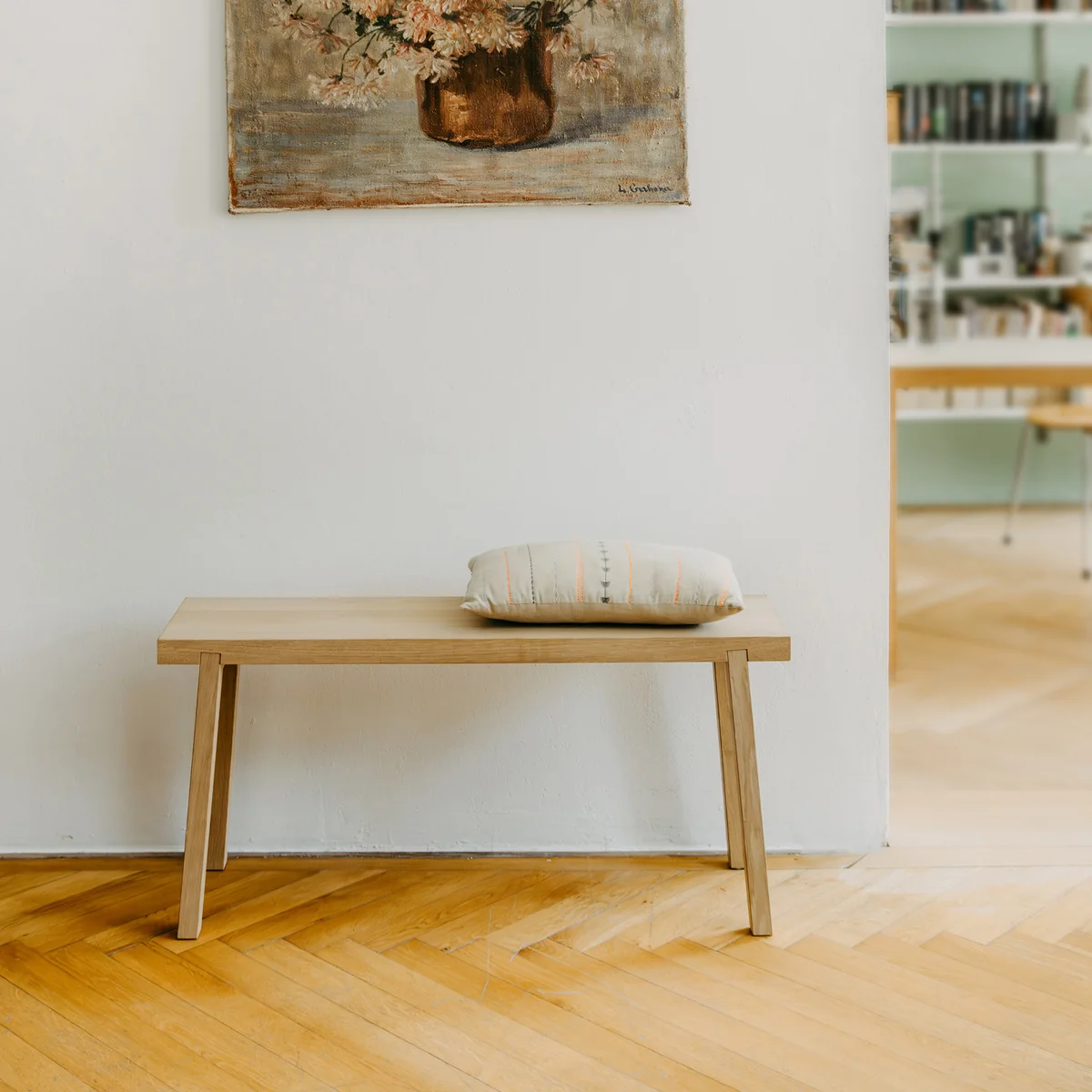 Ontworpen door de Taschide designstudio, maakt de krukbank indruk met zijn minimalistische, moderne designtaal. Het massieve eikenhout geeft het stabiliteit en een warme, natuurlijke uitstraling - elk stuk is echt uniek met karakter.