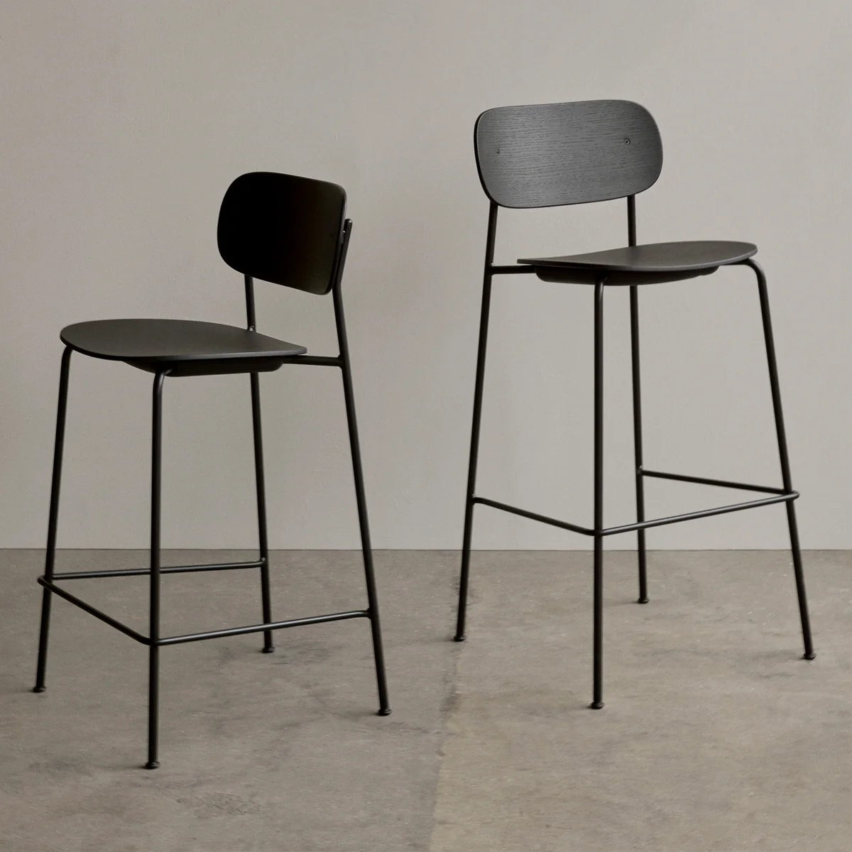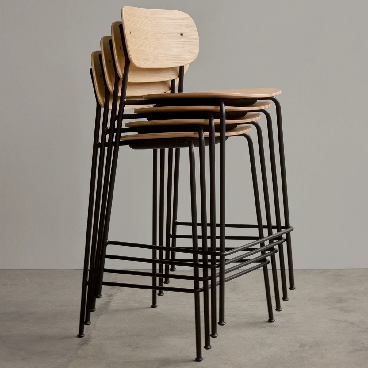Audo s Co Counter Chair wordt gekenmerkt door het evenwichtige contrast tussen een zacht gebogen houten zitting en een slank stalen buisframe. De rugleuning is licht gebogen voor optimale ondersteuning en zitcomfort.