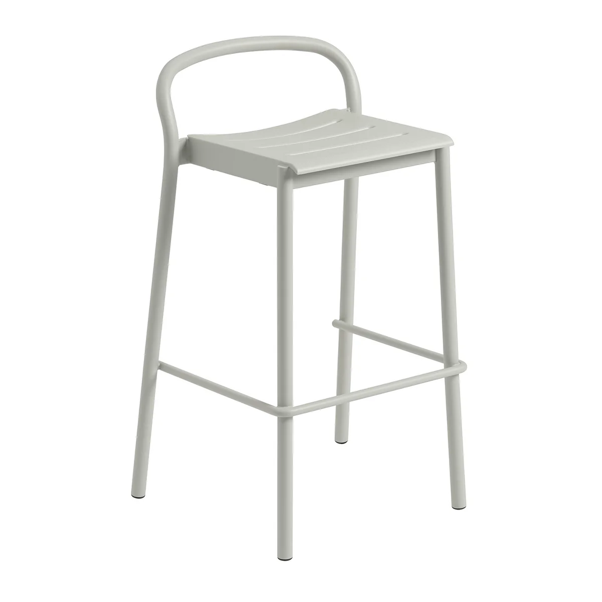 De Linear Steel Outdoor barkruk van Muuto is visueel zuiver gehouden met strakke lijnen om een duurzame esthetiek te garanderen. Het contrast van de gebogen rugleuning en de rechte poten zorgt voor een moderne uitdrukking op privé- en openbare terrassen, het balkon en de tuin.