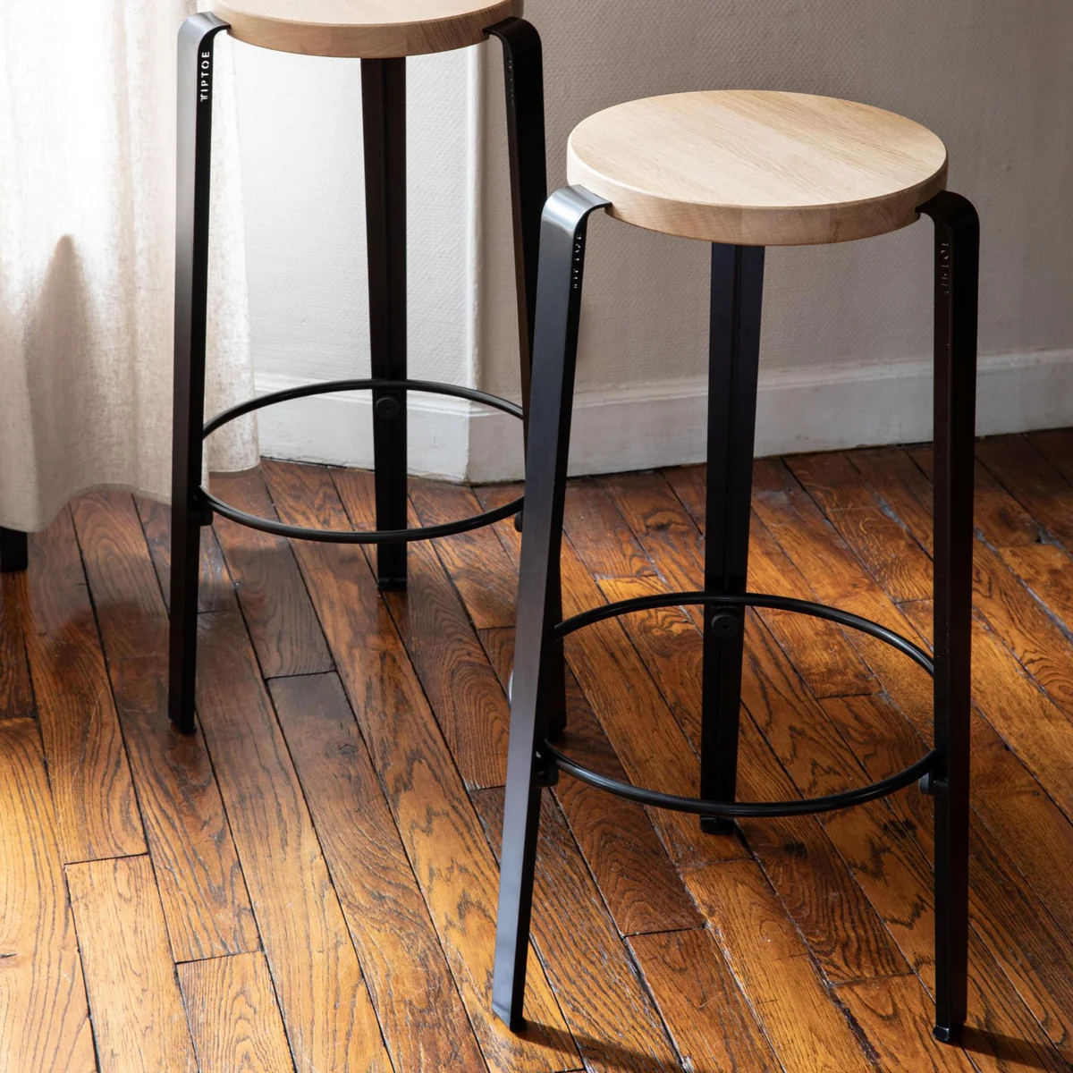 De zitting van de Lou barkruk is gemaakt van massief eikenhout, terwijl de poten van gepoedercoat staal zijn en verkrijgbaar zijn in verschillende kleuren.