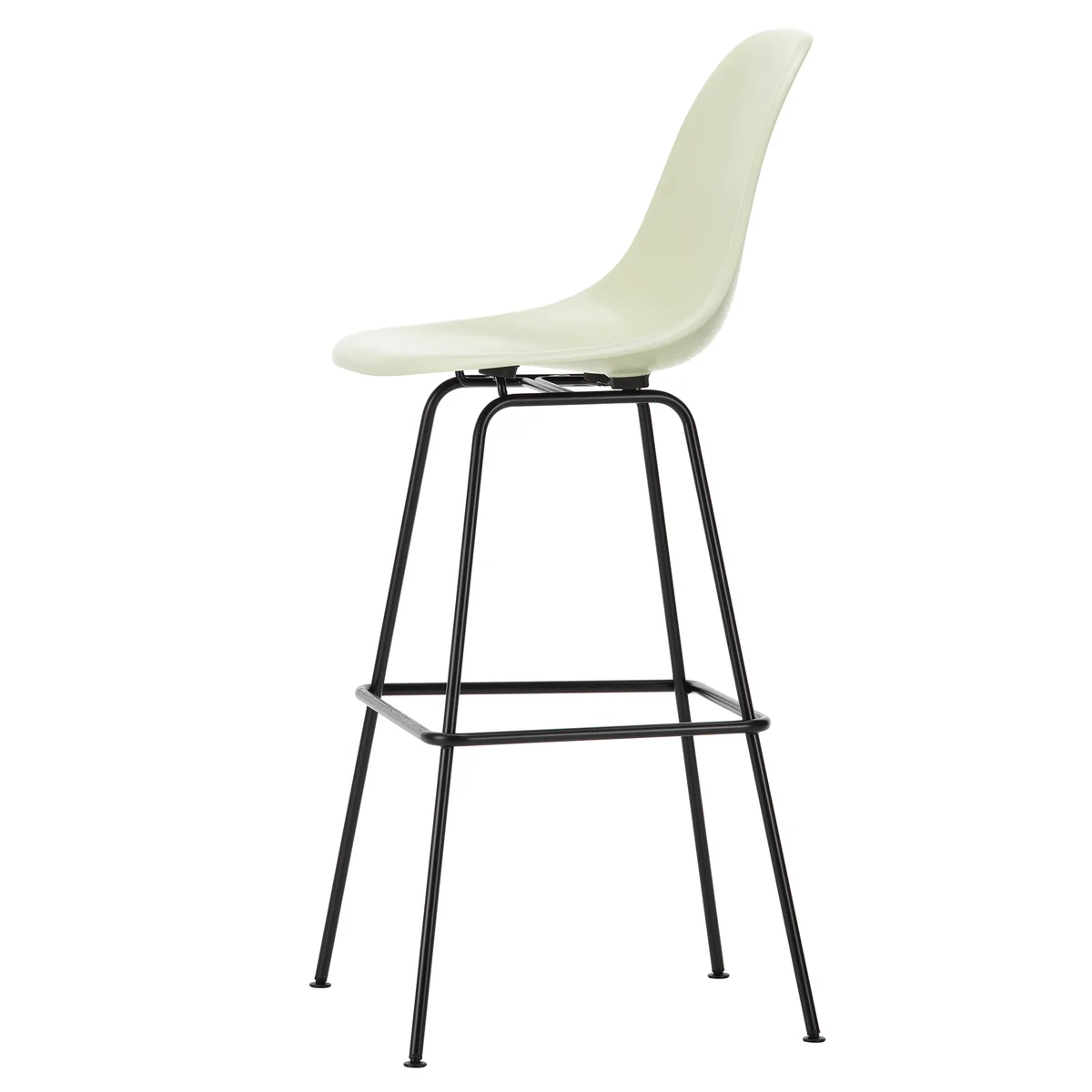 Charles en Ray Eames ontwikkelden de Eames Fiberglass Voor Vitra ontwikkelden Charles en Ray Eames de eerste industrieel geproduceerde stoelen van kunststof. Hun organisch gevormde zitschalen zijn verkrijgbaar met verschillende onderstellen. Het vierpotige onderstel van de Eames Fiberglass barstoel is verkrijgbaar in twee hoogtes: medium voor typische keukenbars en hoog voor hoge tafels. Het is zwart gepoedercoat of verchroomd en heeft een voetsteun.