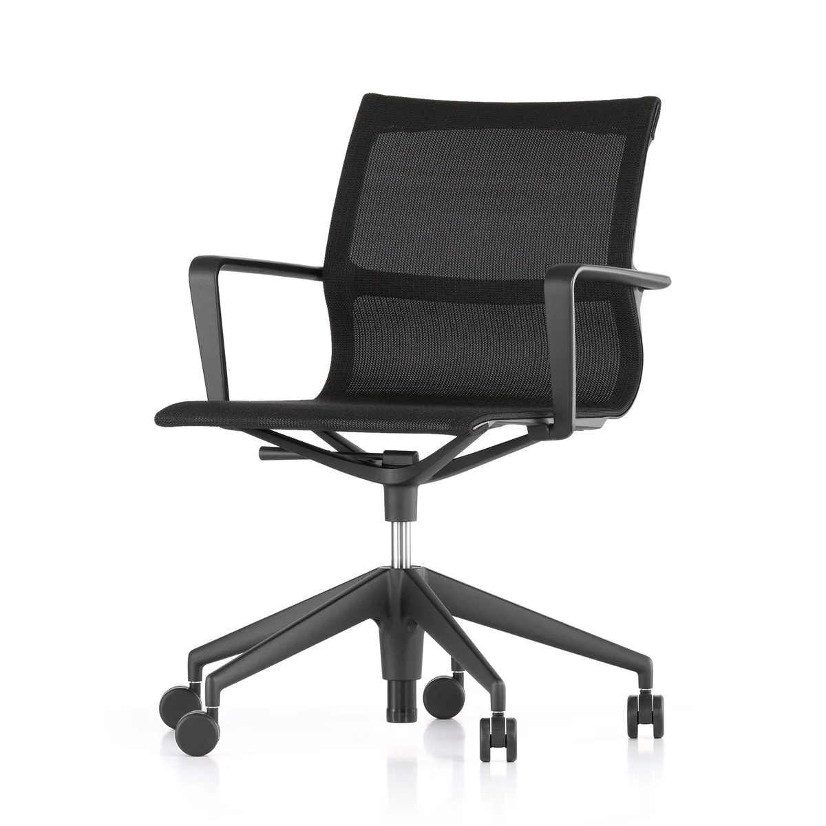 Physix Studio van Vitra is een verlaagde bureaustoel met een comfortabele zitschaal en een in hoogte verstelbare vijfvoet op wielen. De Italiaanse ontwerper Alberto Meda kwam op het idee om een doorlopende zitschaal te creëren door een textiel tussen twee zijstangen te spannen.