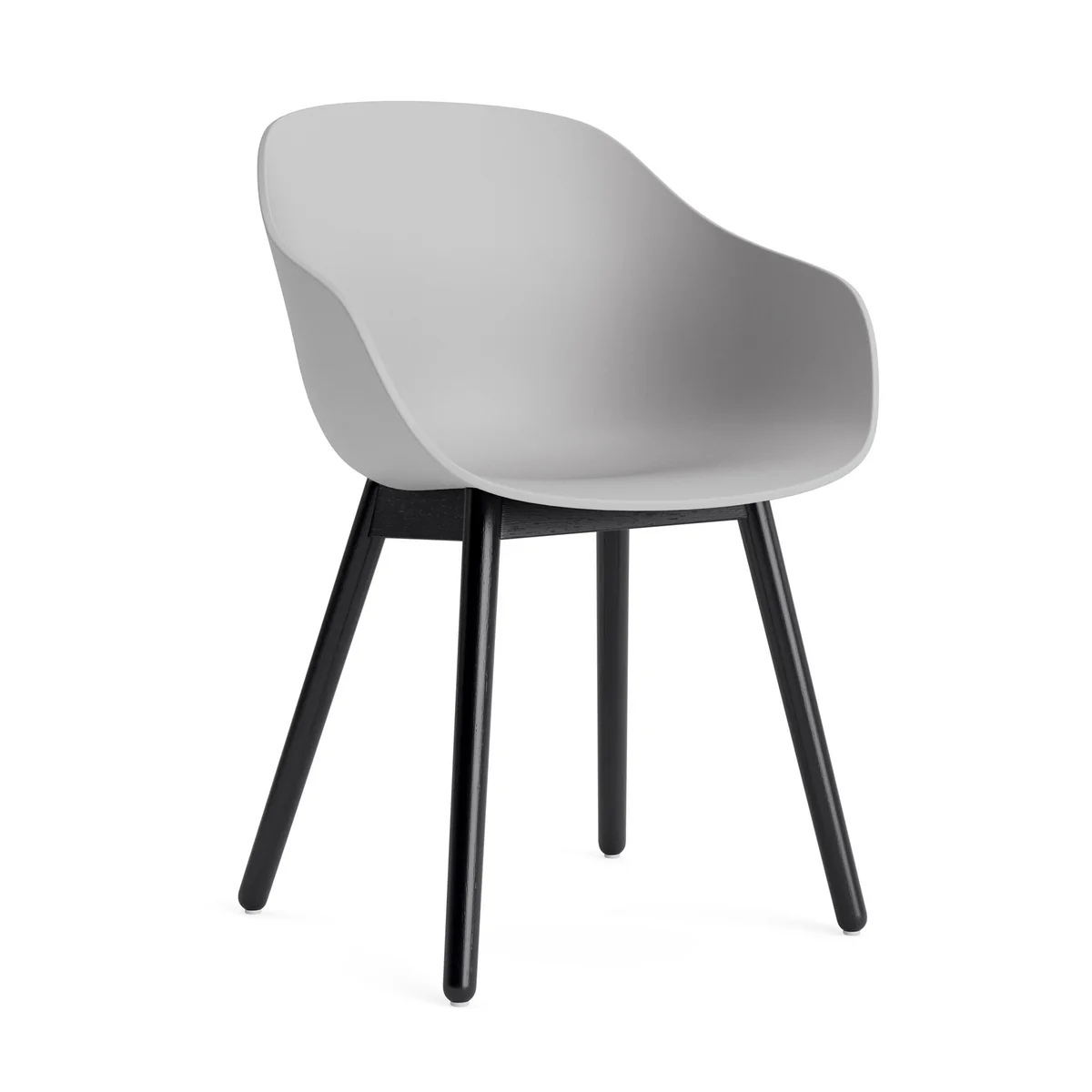 About A Chair AAC 212 De stoel heeft armleuningen en een houten onderstel met vier poten. De niet-gestoffeerde zitschaal is gemaakt van doorgeverfd polypropyleen en het onderstel is verkrijgbaar in verschillende versies, waardoor de stoel kan worden gepresenteerd in een eenkleurige, monochrome look of met een houten onderstel.
