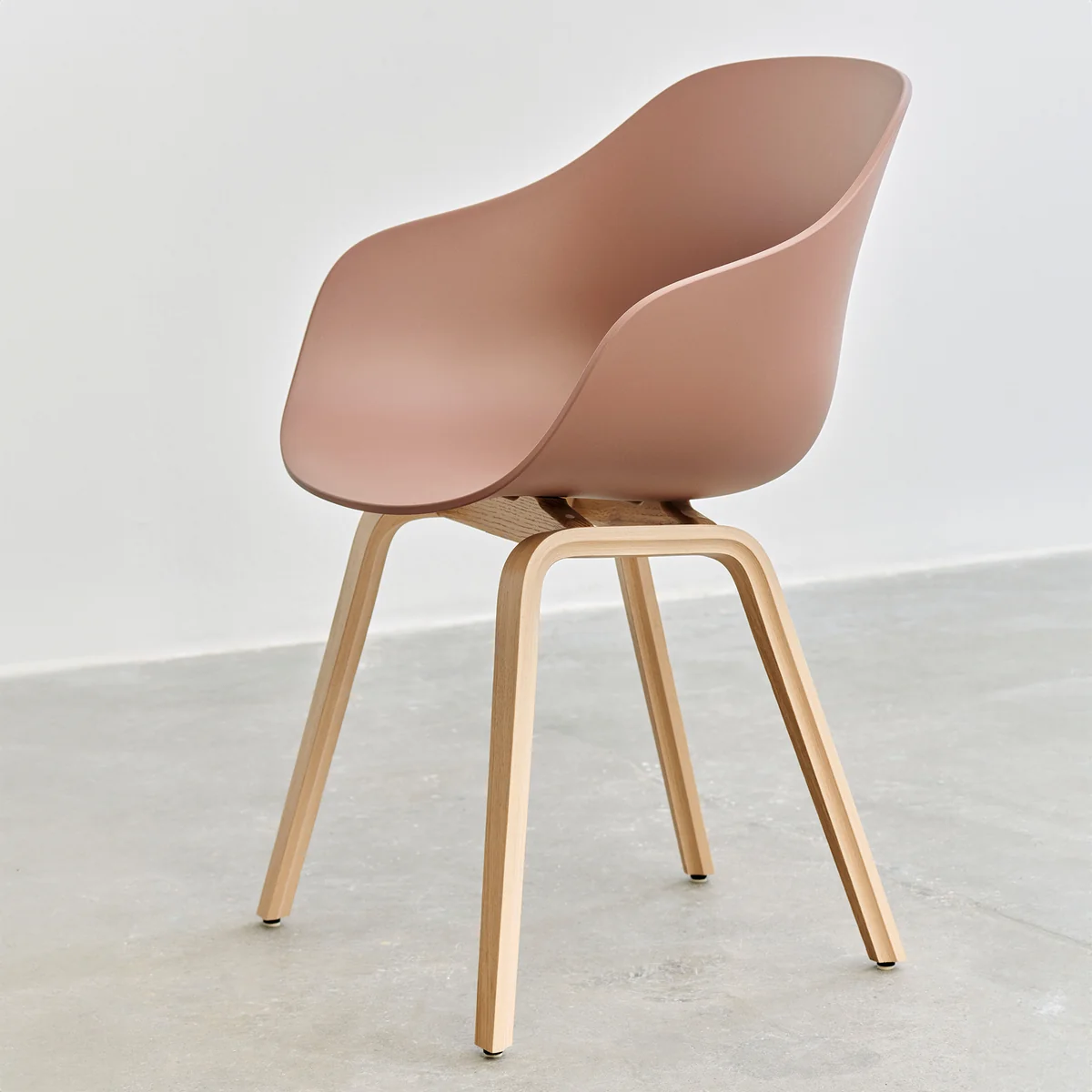 De About A Chair AAC 222 heeft armleuningen en een houten onderstel met vier poten. De zitschaal is gemaakt van effen polypropyleen en het onderstel is verkrijgbaar in verschillende versies.