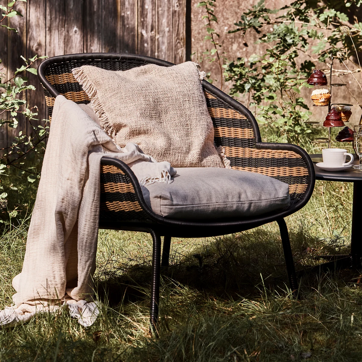 Samen met een zitkussen en een deken krijg je een comfortabele en stijlvolle stoel die zowel de woonkamer als het terras opfleurt. Geschikt voor zowel binnen als buiten.