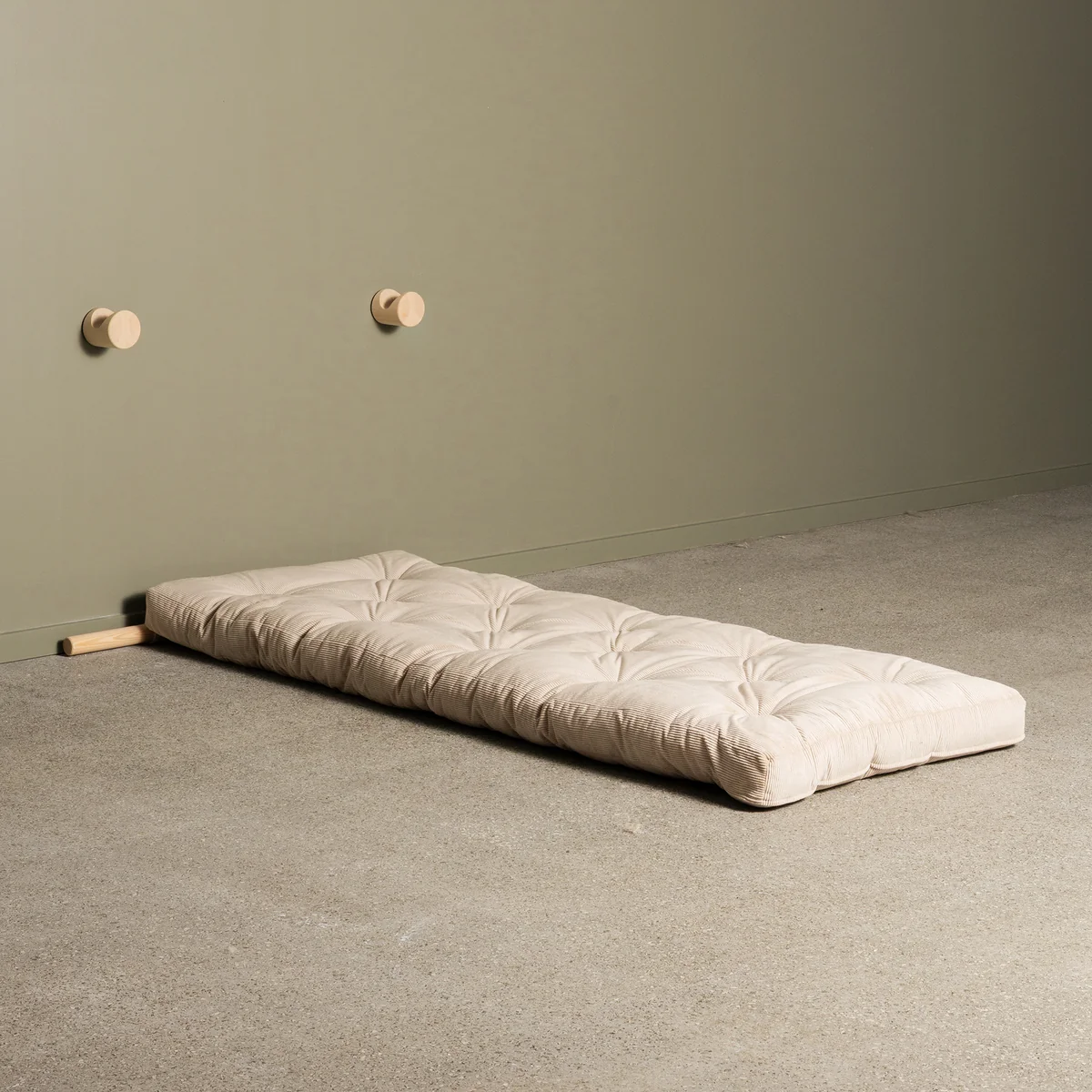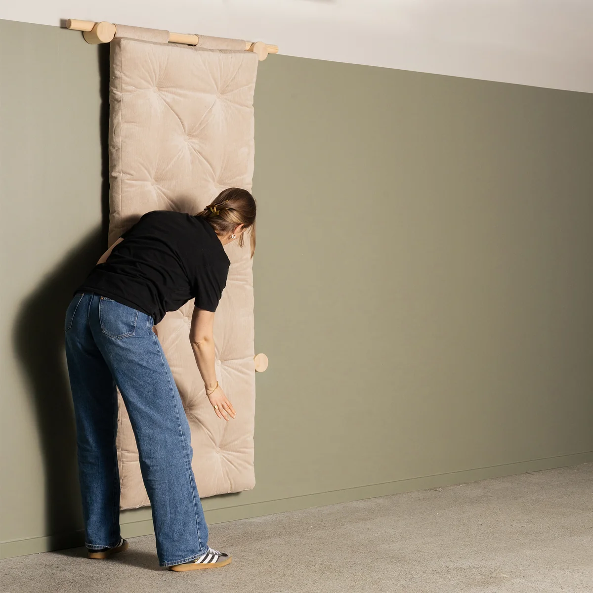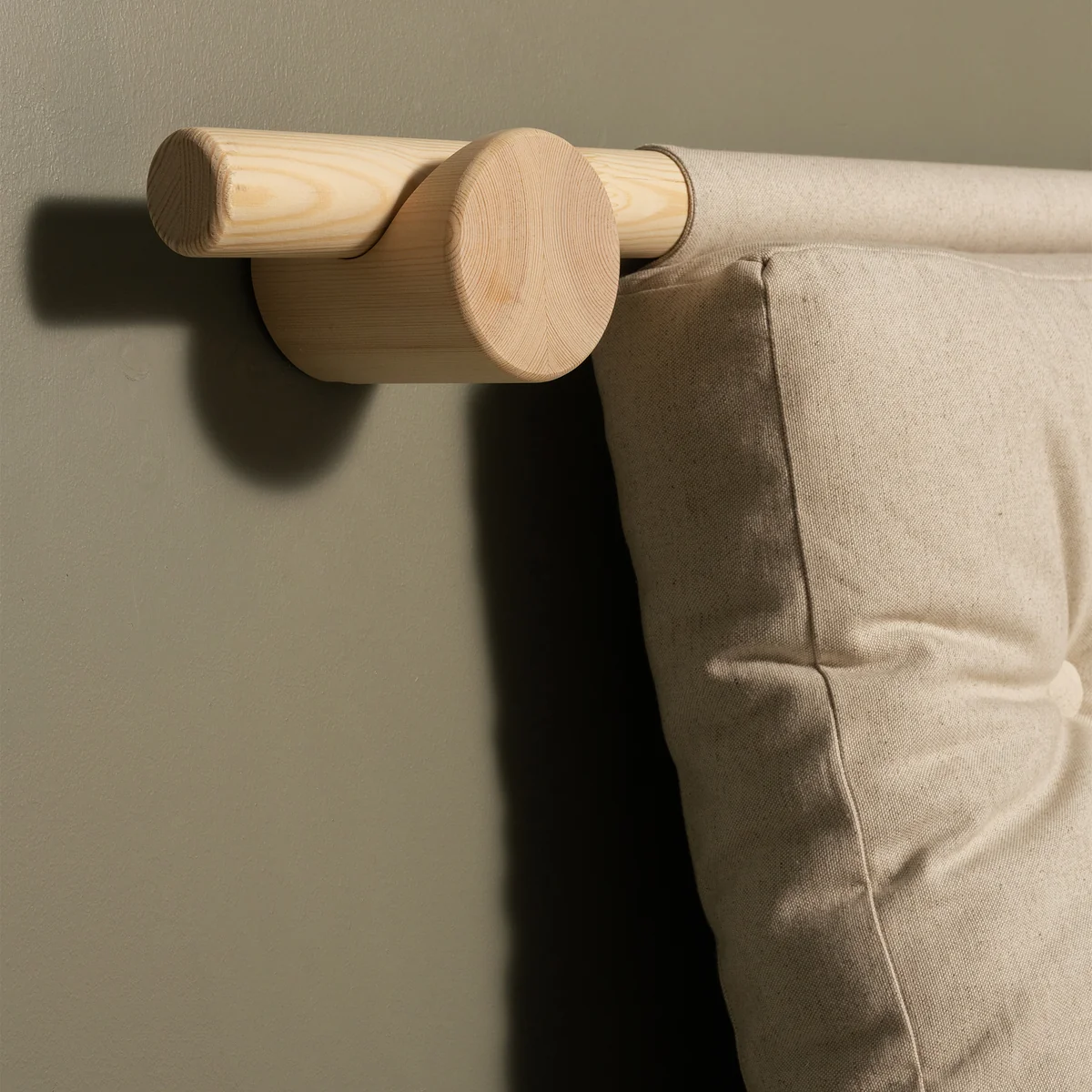 De Hooked slaapstoel van Karup Design is de perfecte combinatie van ruimtebesparende functionaliteit en minimalistische, Scandinavische stijl. Het doordachte concept bestaat uit een hoogwaardige Bravo matras (75 x 200 cm), stevige muurbeugels en een elegante houten stang waaraan de matras wordt opgehangen. Zo ontstaat een comfortabele fauteuil met een luchtige lichtheid overdag - en een volwaardige slaapmogelijkheid 's nachts.