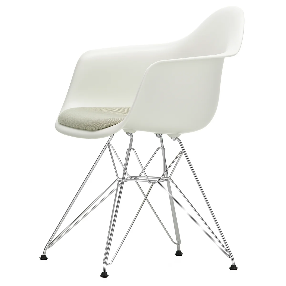 De Eames Plastic Armchair DAR Vitra van combineert iconisch design met modern comfort. De stoel is ontworpen door Charles en Ray Eames en wordt gekenmerkt door de ergonomische zitschaal van robuust kunststof en het elegante draadframe in de zogenaamde "Eiffeltoren" constructie. Het geïntegreerde zitkussen zorgt voor extra comfort en maakt de DAR een stijlvolle en functionele zitoptie voor eetkamers, kantoren of vergaderzalen.