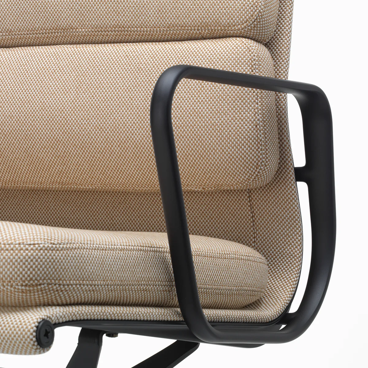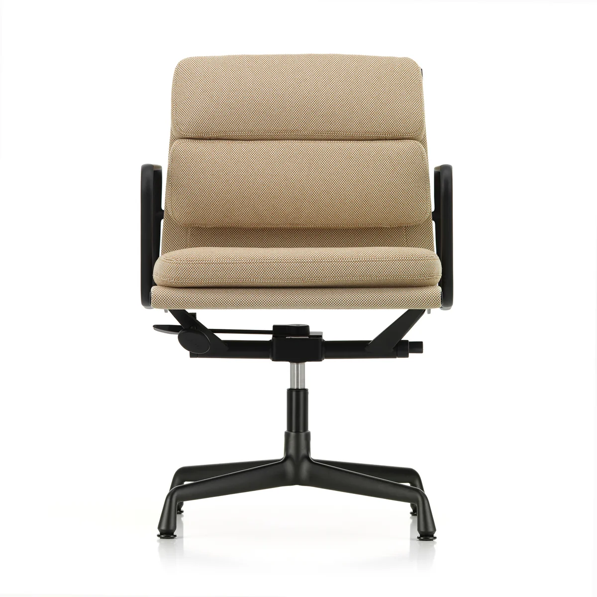 De EA 231 Soft Pad bureaustoel met armleuningen van Vitra is uitgerust met een verstelbaar schommelmechanisme en een rechte zitgeometrie, waardoor hij ideaal is voor het werken aan een bureau. Omdat hij echter geen wielen heeft, straalt hij een gezellige sfeer uit en verschilt hij van conventionele bureaustoelen. Daarom past hij perfect in een chique thuiskantoor.