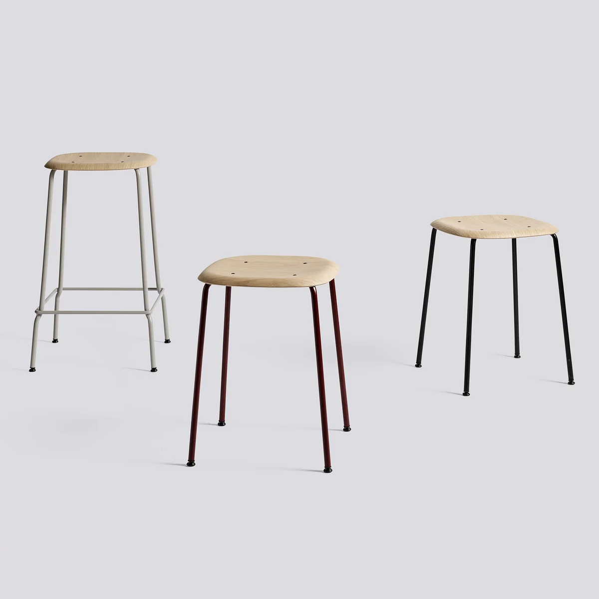 De uitnodigende zitting van mat gelakt eikenfineer met zijn sterke rondingen vormt een spannend contrast met het rechtlijnige ontwerp van de poten. Ook de materialen konden niet meer verschillen, de poten zijn gemaakt van gepoedercoat staal. Ze geven de kruk een industriële flair en zorgen ervoor dat hij in de meest uiteenlopende situaties goed tot zijn recht komt.