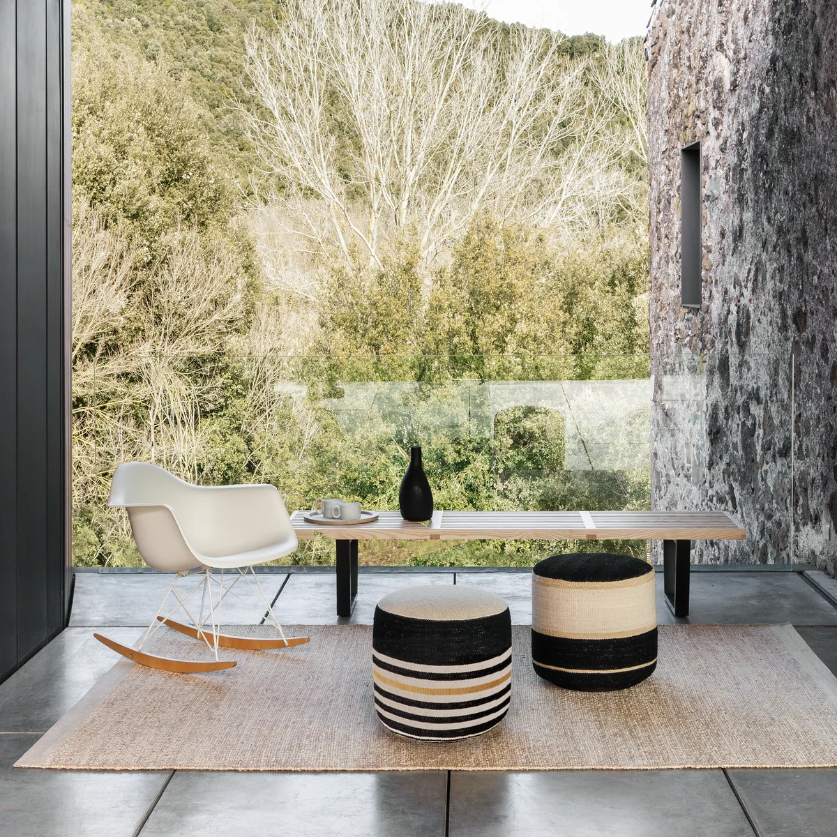 Met zijn discrete en klassieke uitstraling past de Kelim Pouf in een grote verscheidenheid van inrichtingsstijlen in verschillende kamers. Het is gemaakt van 100% Afghaanse wol en is verkrijgbaar in verschillende versies. De wolvezel is met de hand gesponnen en heeft daardoor een natuurlijke onregelmatige structuur en kleur. De uitzonderlijke lengte en de elastische vezelstructuur maken het zeer slijtvast wanneer het geweven wordt. Hierdoor ontstaan prachtige tapijten met een lange levensduur.