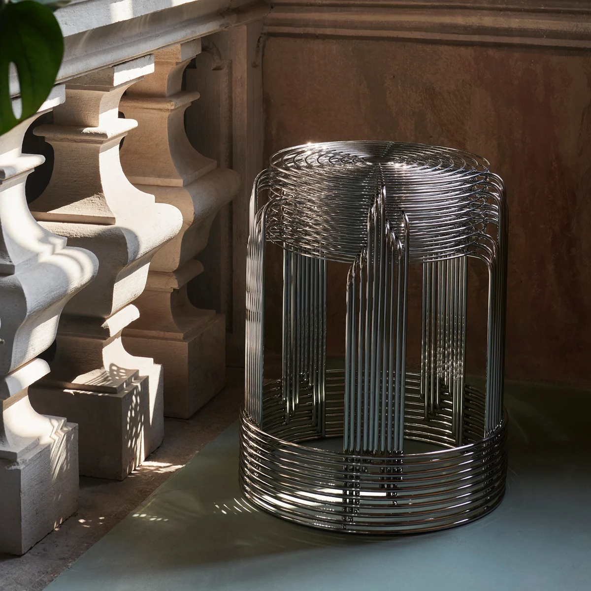 De Wire Hocker VP11 van & Tradition belichaamt Verner Pantons voorkeur voor geometrische vormen en draad als visueel element. Wire werd oorspronkelijk in 1981 op de markt gebracht. De nieuwe editie van de lichtgewicht, stapelbare kruk dient ook als veelzijdige bijzettafel.
