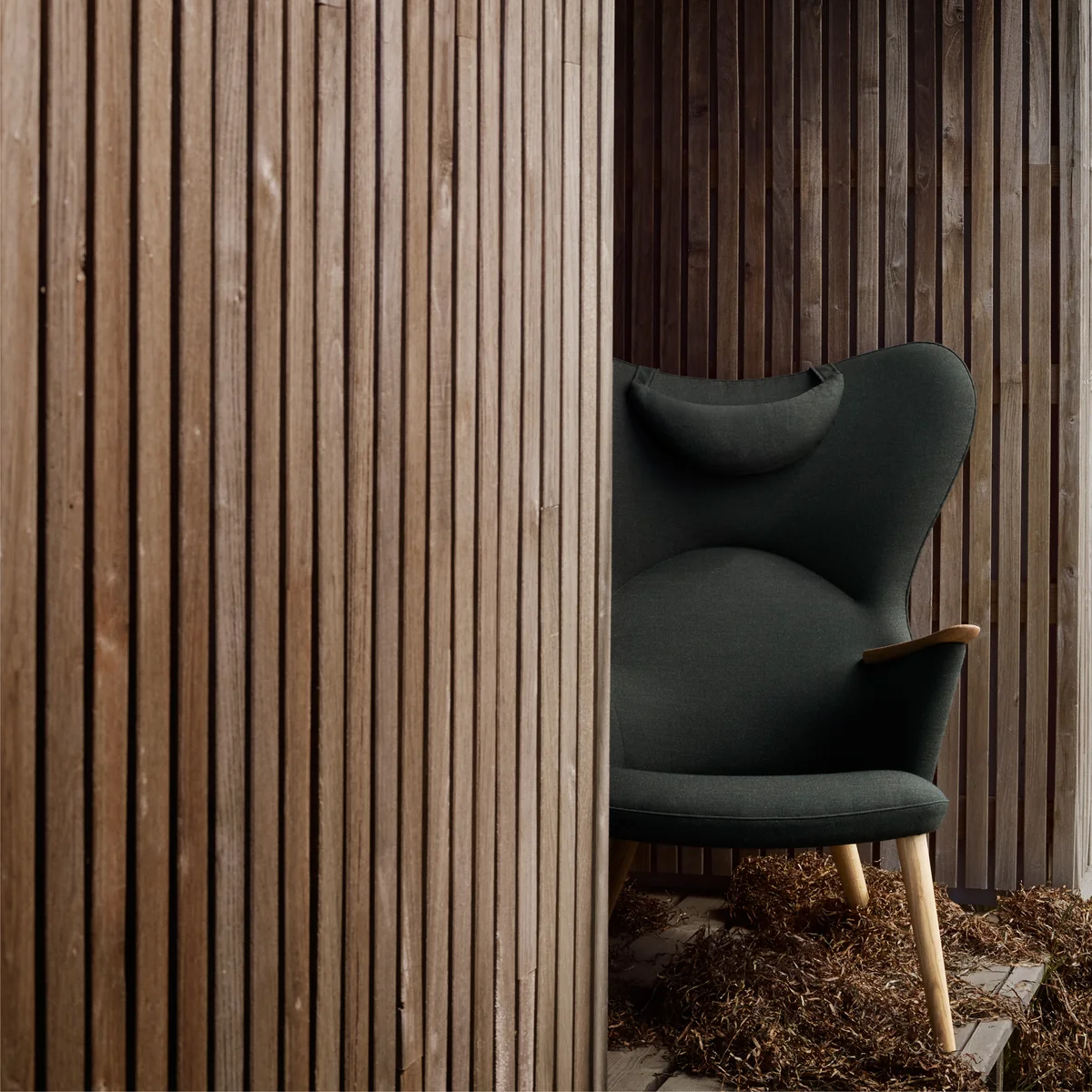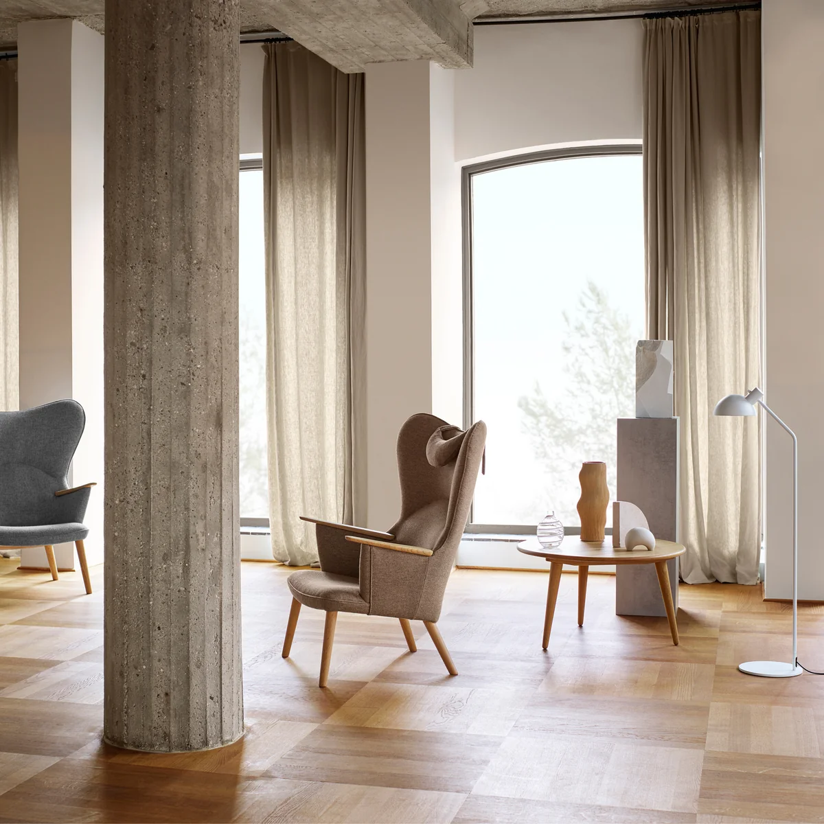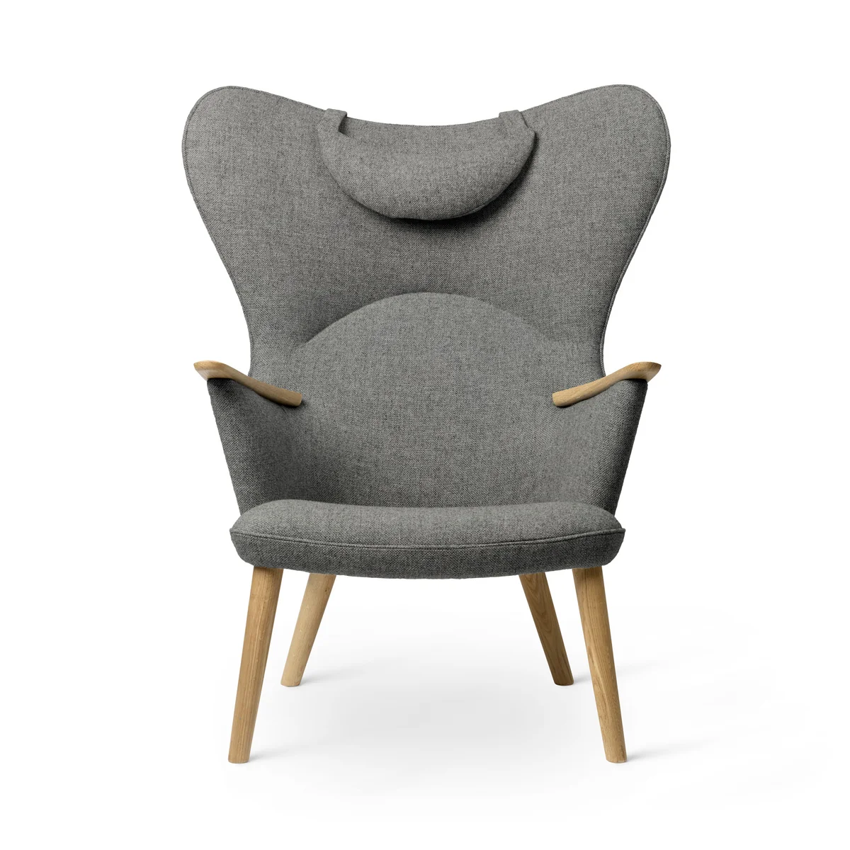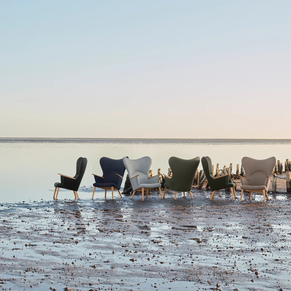 De CH78 van Carl Hansen , liefkozend bekend als de Mama Bear Lounge Chair, wordt gekenmerkt door uitnodigende rondingen die een warme omhelzing bieden. Zijn bijzonder esthetisch karakter dankt hij aan het evenwicht tussen zachte, ronde vormen en dynamische geometrieën en aan fijne details zoals de houten klauwen op de armleuningen.