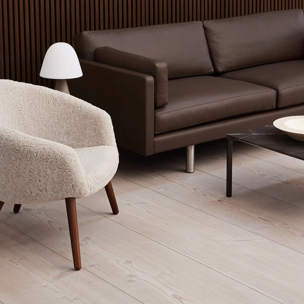 De krommen van de Ditzel De rondingen van de Lounge Chair zijn zorgvuldig uitgedacht om er vanuit elke hoek zo elegant mogelijk uit te zien. De brede, in elkaar grijpende rug- en armleuningen en de fijne stoffering bieden maximaal comfort. De moderne interpretatie van de traditionele fauteuil is gemaakt van walnoothout en schapenvacht.