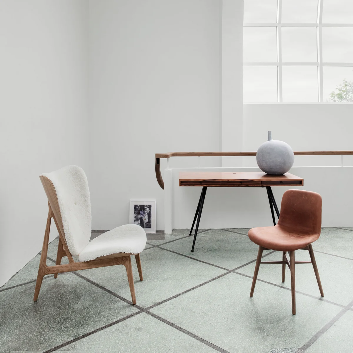 De Elephant Lounge fauteuil is handgemaakt van massief eikenhout. De fauteuil is leverbaar in verschillende framevarianten en kan worden bekleed met leer, stof en schapenvacht.