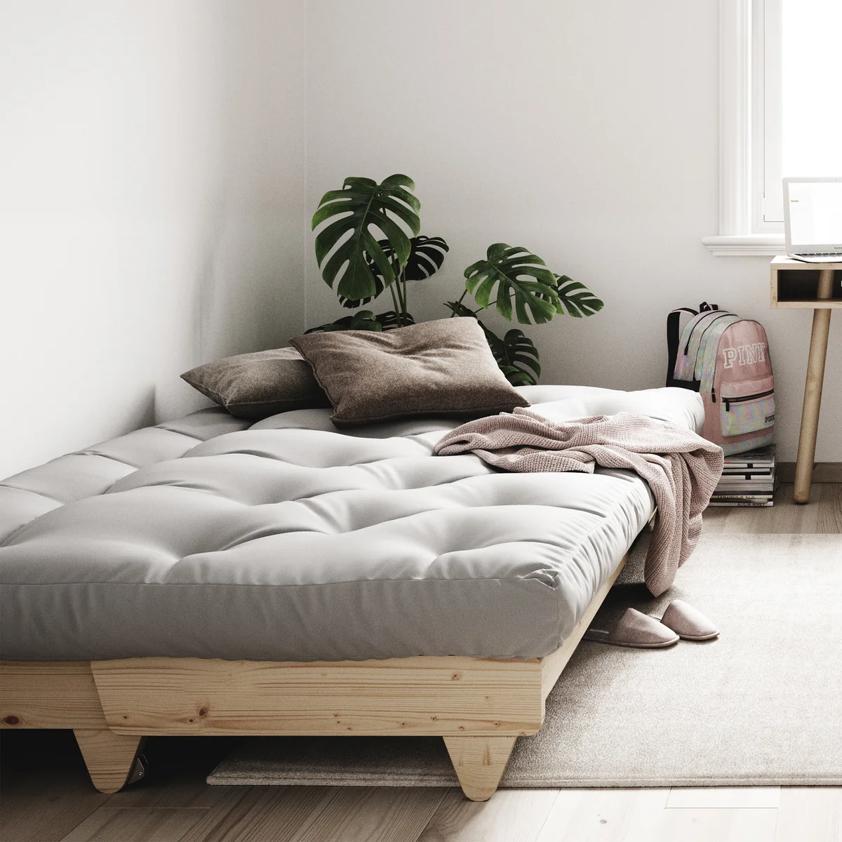 De bank bestaat uit een frame van dennenhout en de hoes van de futon is gemaakt van katoen en polyester.