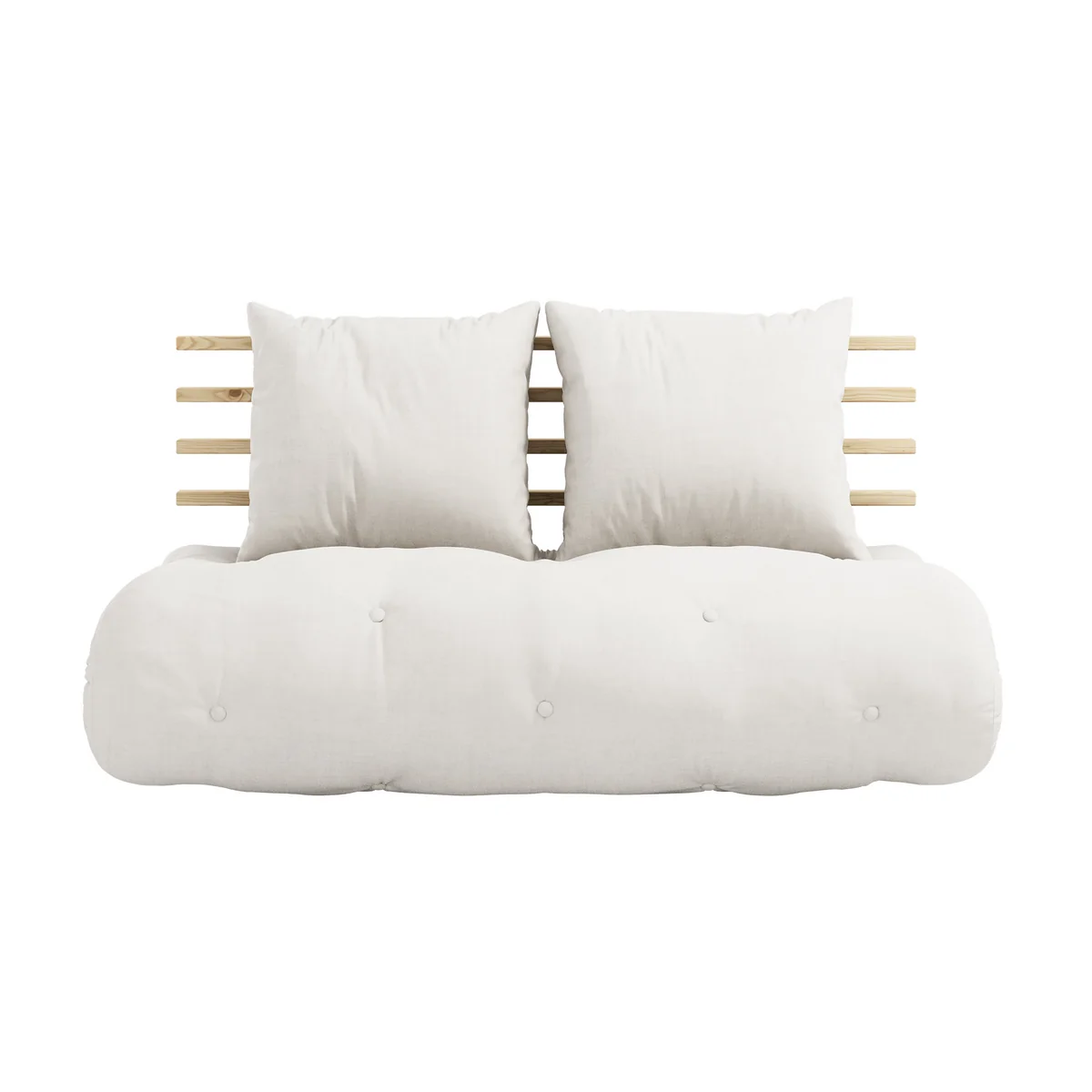 De Shin Sano bank van Karup maakt indruk met zijn tijdloze minimalisme en geraffineerde functies. De bank heeft een comfortabele, dikke futonmatras van 15 cm gerecyclede mengvezel met een kern van 4 cm schuim, die aan de achterkant wordt omgeven door een stijlvolle lattenbodem van grenenhout. Trek de futon plat uit en in enkele seconden heb je een mooi, groot logeerbed met een hoofdeinde en twee comfortabele kussens om tegenaan te leunen.