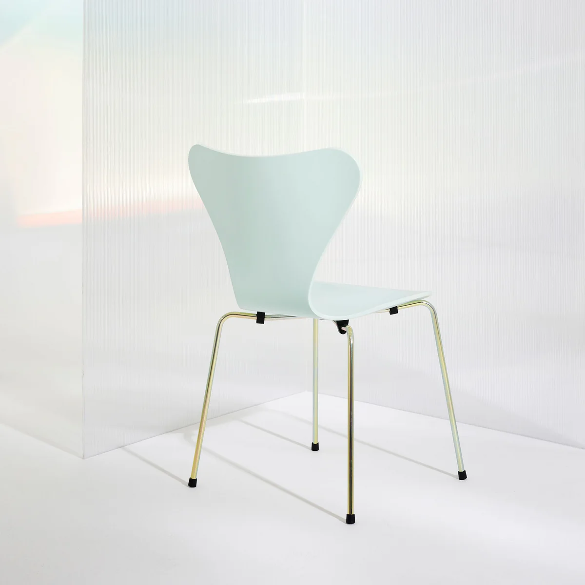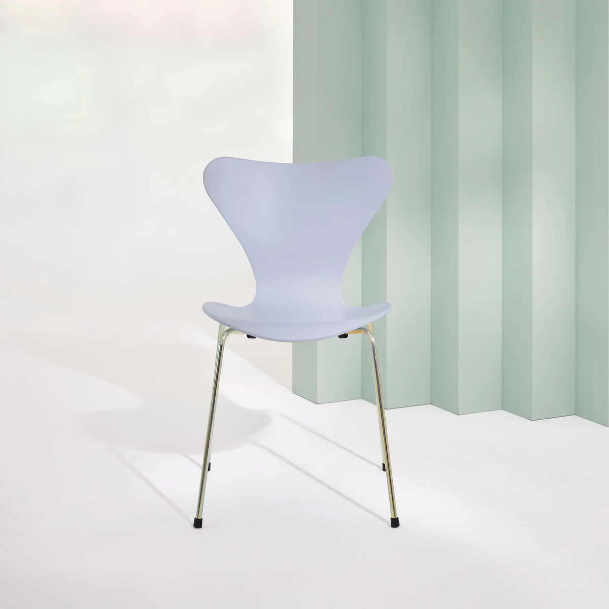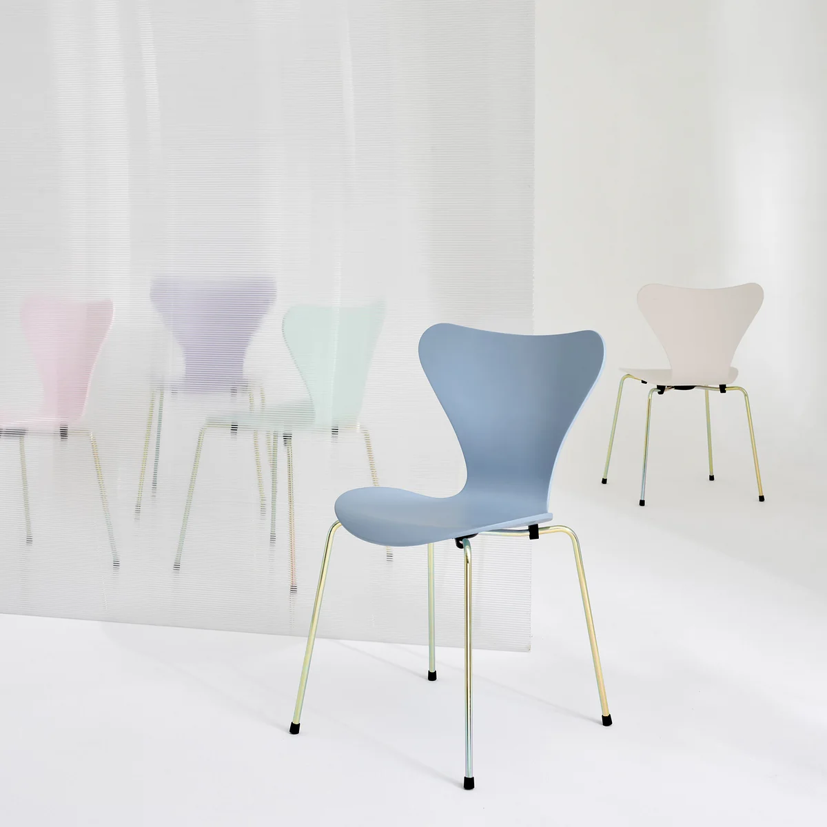 De speciale editie van deze Serie 7 stoel vangt de zachte schoonheid van het Deense ochtendlicht en geeft Arne Jacobsens iconische Serie 7 stoel een nieuw, poëtisch kleurenpalet. De vijf delicate tinten (verkrijgbaar in groen, beige, roze, paars en blauw) weerspiegelen de kleuren van een herfstige ochtend en worden gecombineerd met een Rainbow frame. Deze subtiele nuances creëren een rustige, harmonieuze sfeer en kunnen gemakkelijk worden gecombineerd met het bestaande Fritz Hansen kleurenpalet en met elkaar.