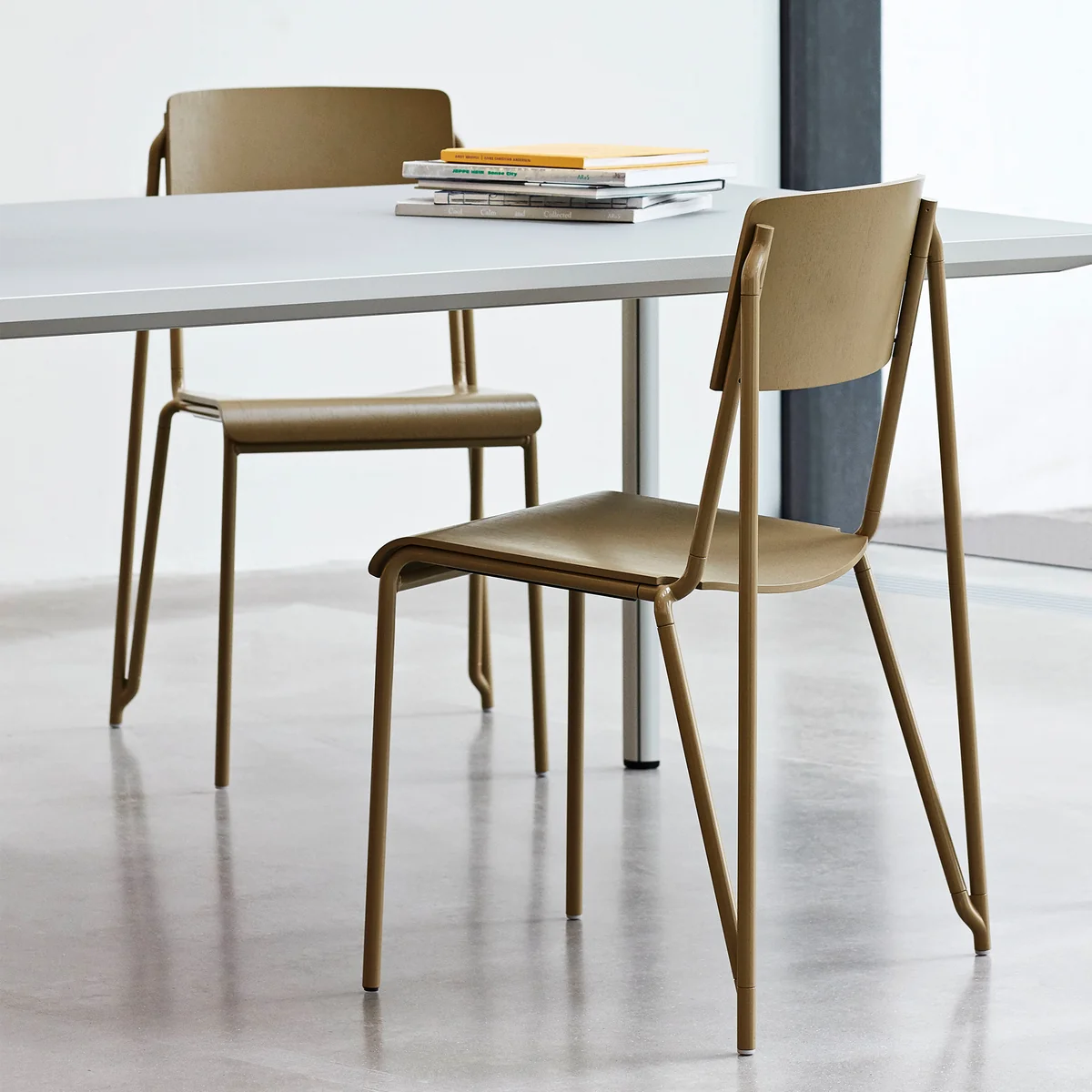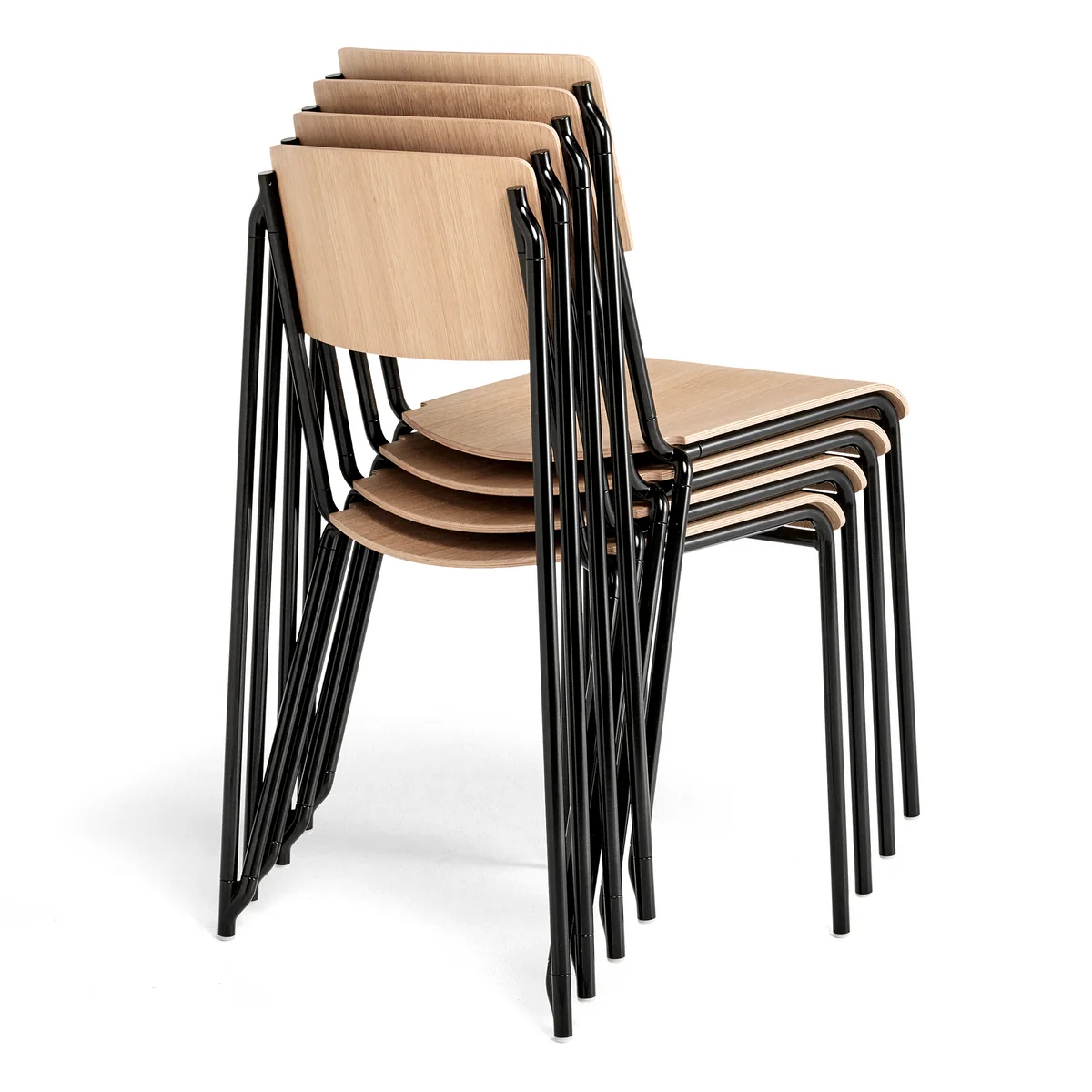 Het bijna iconische ontwerp kan in verschillende omgevingen worden geïntegreerd, of het nu in de eetkamer, kantoor of in openbare ruimtes zoals restaurants of evenementenhallen is. Afgeronde vlakken en randen zorgen voor optimaal zitcomfort en het slanke, driehoekige frame voor stabiliteit.