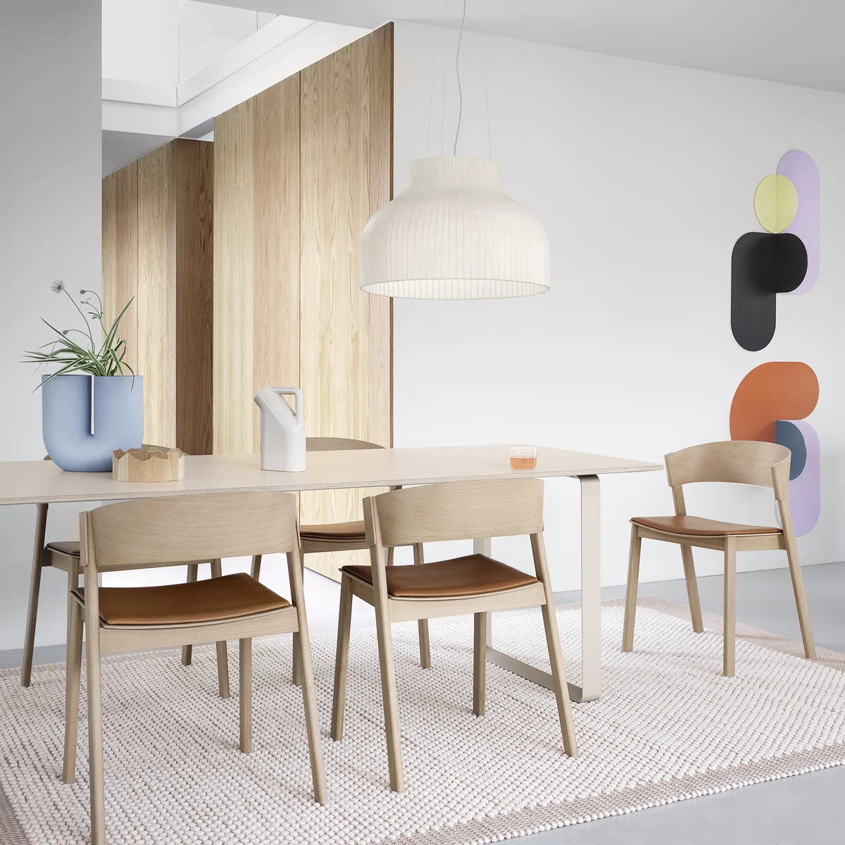 Muuto vervaardigt de Cover Stoel volledig in eikenhout. De bekleding is verkrijgbaar in verschillende uitvoeringen. Net als de natuurhouten versie valt ook de gekleurde versie van de stoel op door zijn natuurlijkheid - want de nerf van het hout wordt niet verborgen door de "vernis".