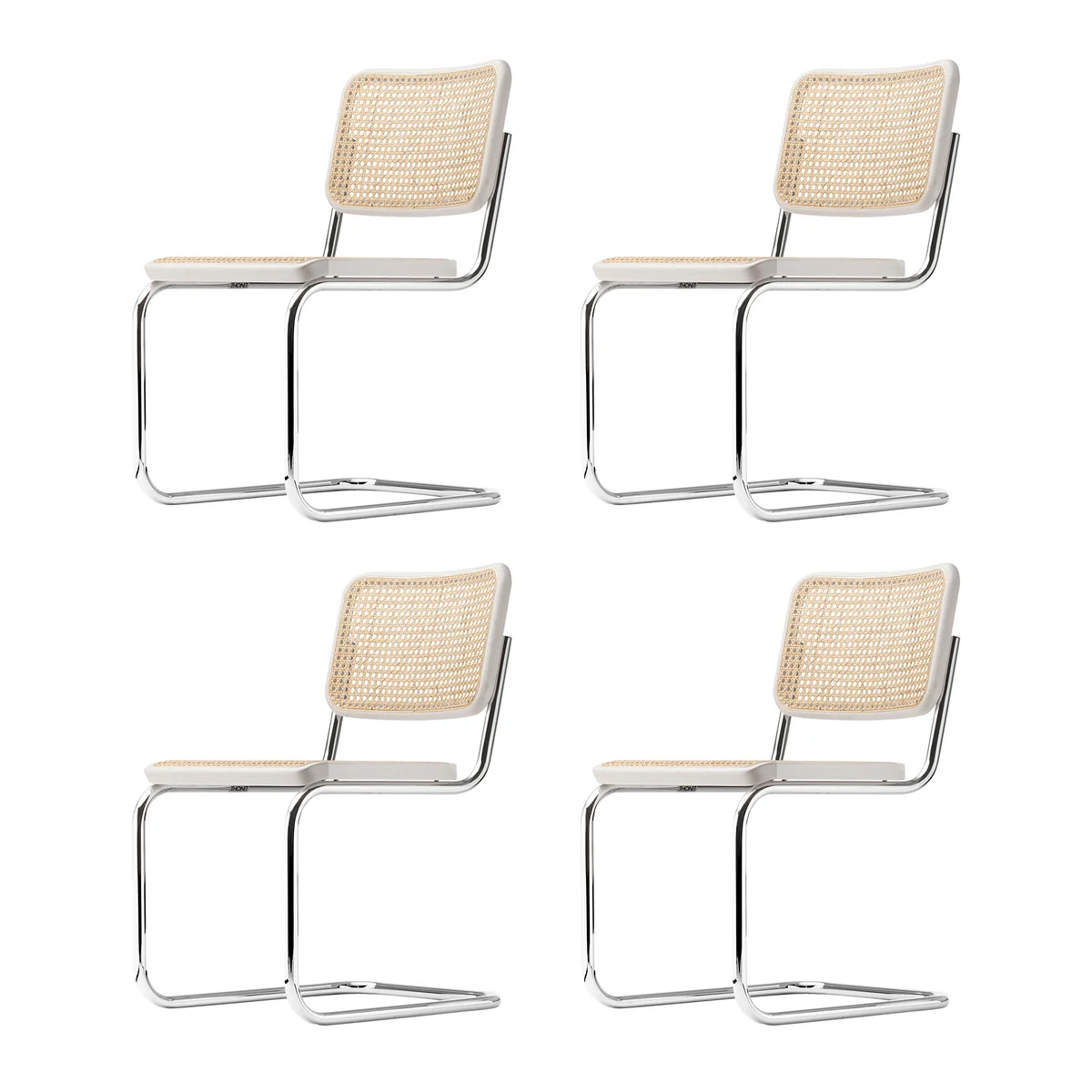 Dankzij de esthetische reductie en helderheid past de S 32 in veel privé- en openbare ruimten: Conferentieruimten, wachtkamers, restaurants of zelfs in je eigen eetkamer of studeerkamer. Het stalen buisframe is verkrijgbaar in verchroomd of in kleur gelakt en de houten onderdelen zijn gemaakt van gebeitst beuken of geolied notenhout. De bekleding met buisvormig gaas in verschillende kleuren wordt ondersteund door een kunststof stof die voor stabiliteit zorgt.