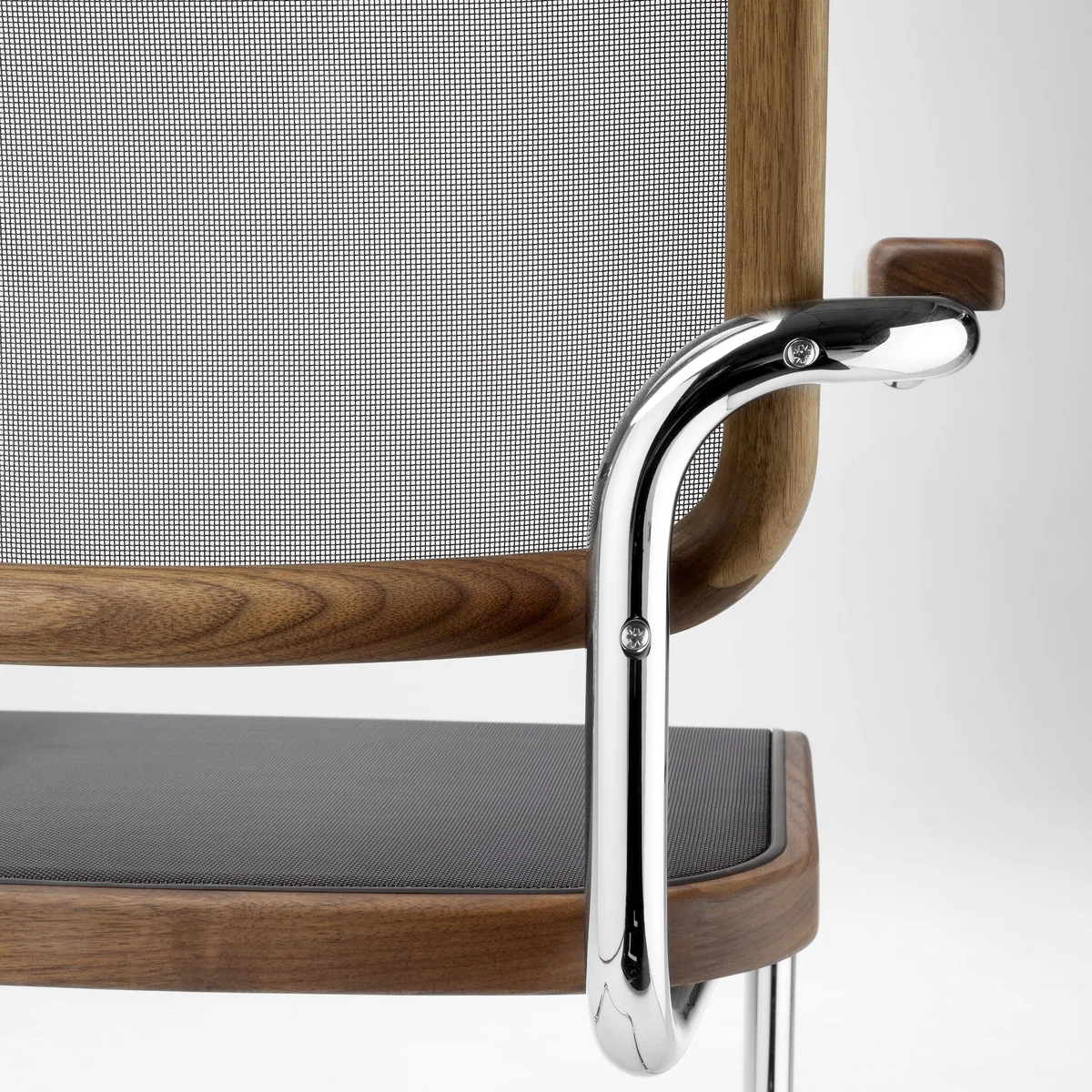 Thonet Waarschijnlijk de bekendste sledestoel van stalen buizen aller tijden heeft nu een moderne en frisse look met een netbespanning op de zitting en rugleuning in de S 64 N fauteuilversie van .