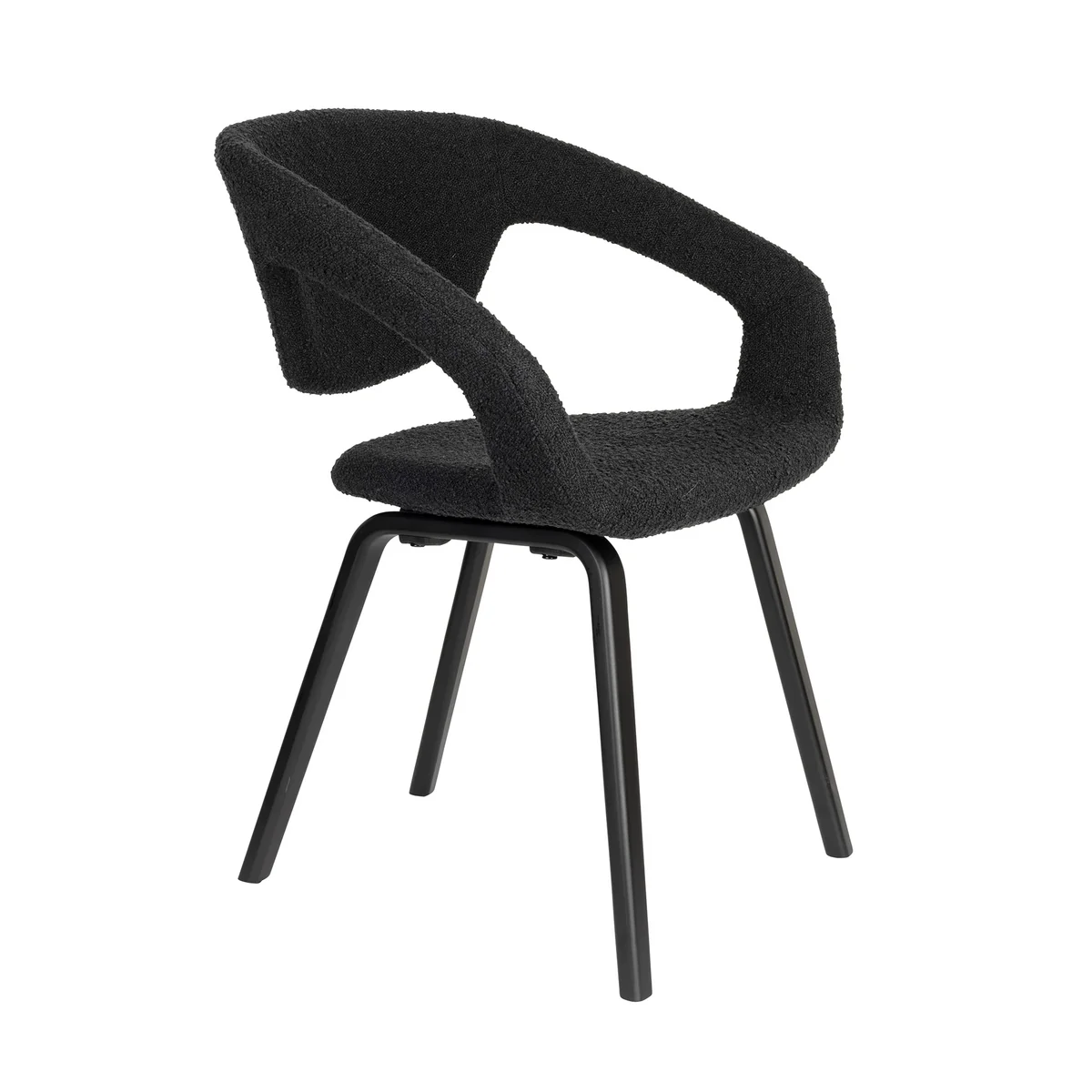 De zitschaal met zachte bouclébekleding voelt prettig aan en geeft de stoel een gezellige, moderne uitstraling. Het massief beukenhouten onderstel zorgt voor stabiliteit en vormt een natuurlijk contrast met het gestoffeerde oppervlak. Dankzij de evenwichtige verhouding tussen functie en esthetiek past de stoel Flexback stoel past in een grote verscheidenheid aan inrichtingsstijlen.