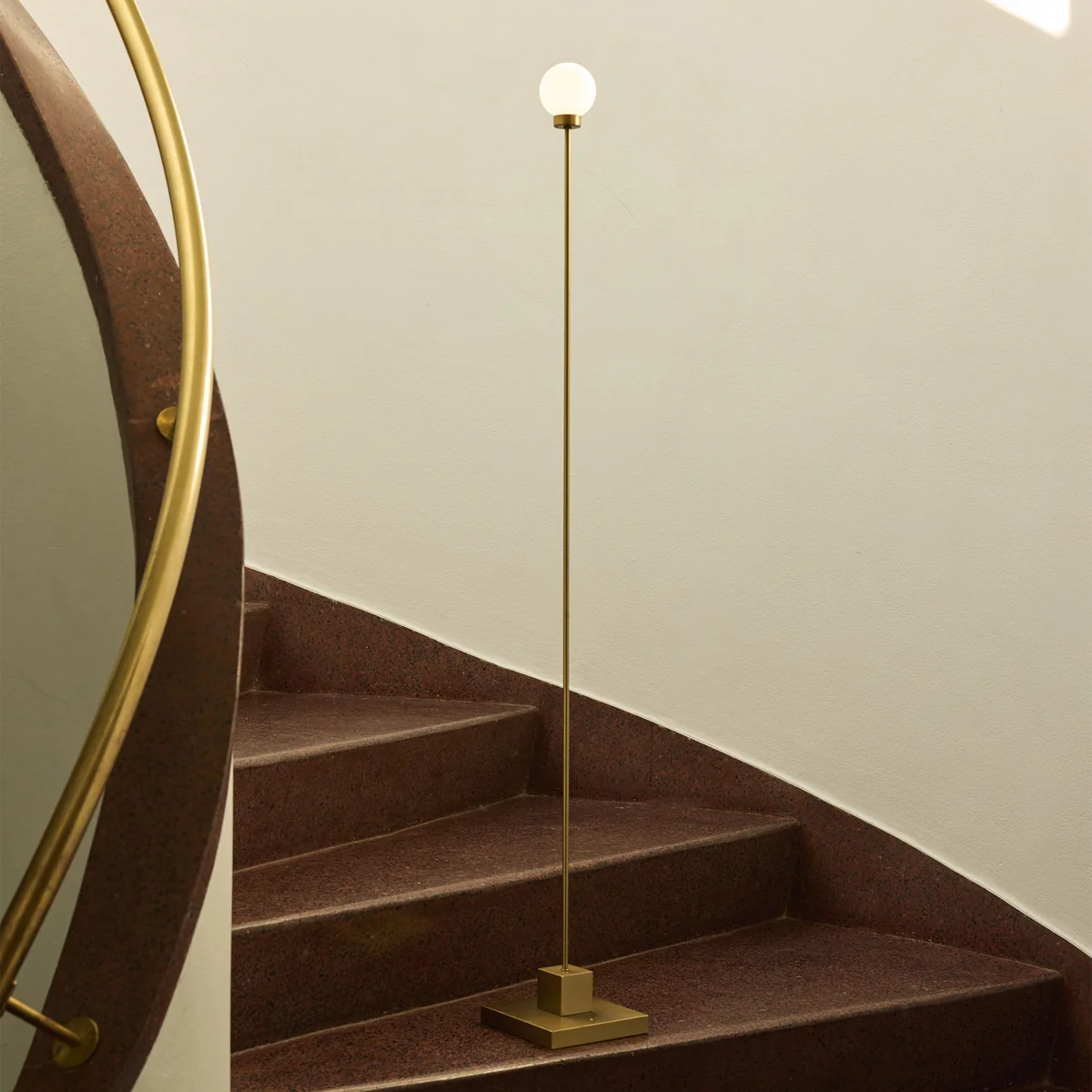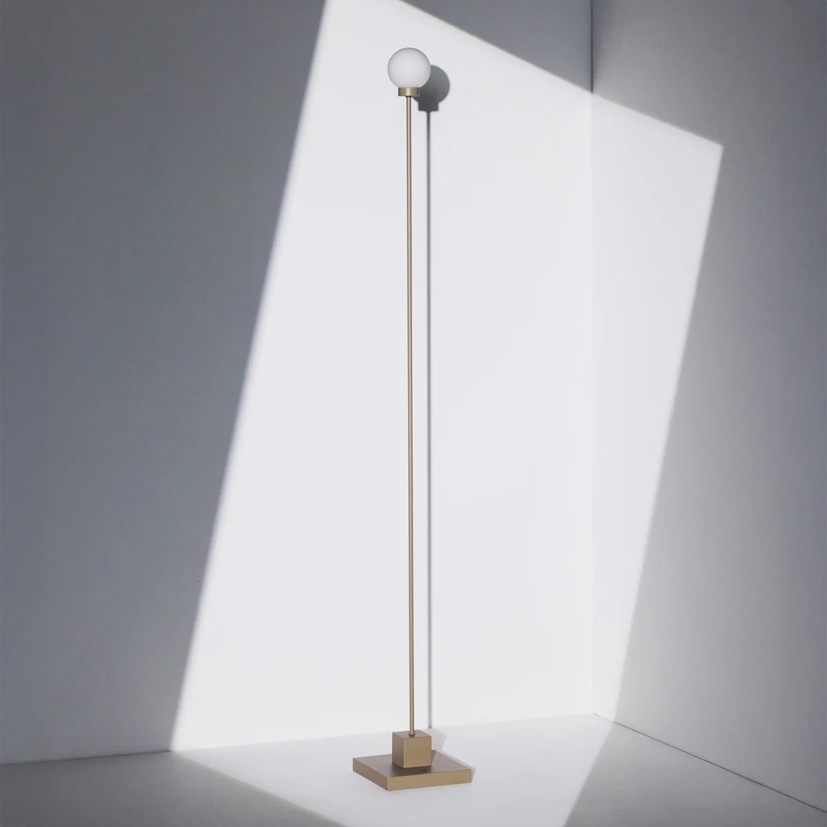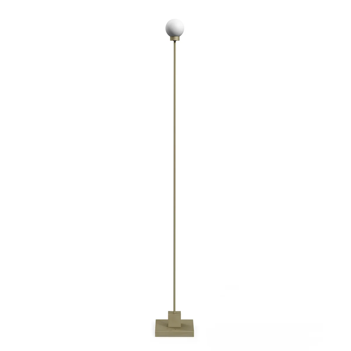 De slanke metalen voet rust op een rechthoekige sokkel en draagt een bolvormige kap van gesatineerd glas, die zacht, diffuus licht geeft. De ronde kap vormt een harmonieus contrast met de strenge, lineaire sokkel.
