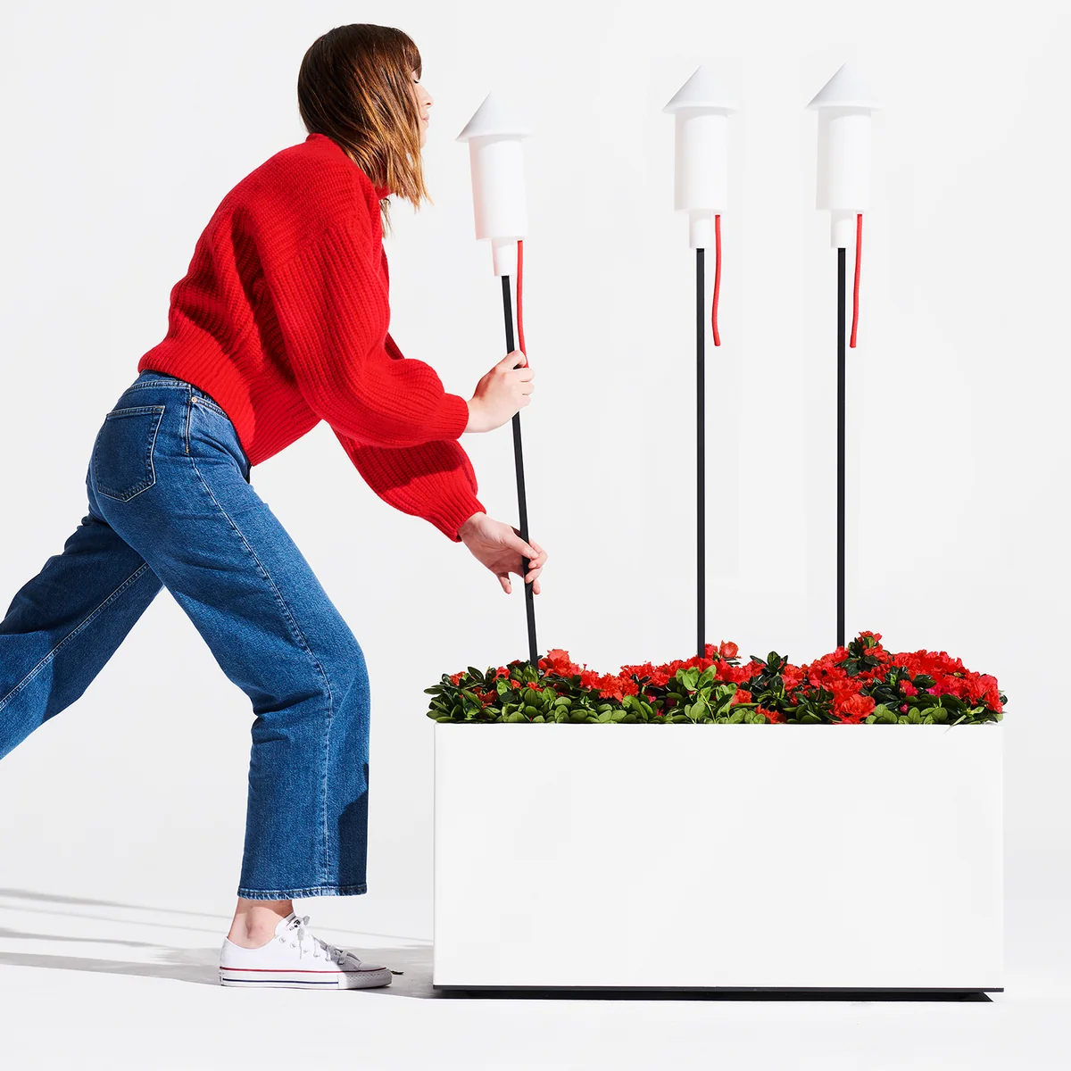 De Prêt a Racket solarlamp van Fatboy kan worden gebruikt om een lang grindpad in de tuin te verlichten en tegelijkertijd op een speelse manier te verfraaien. De zonnelamp kan gemakkelijk in de grond worden gestoken en de tuin wordt een helder verlicht raketlanceerplatform!