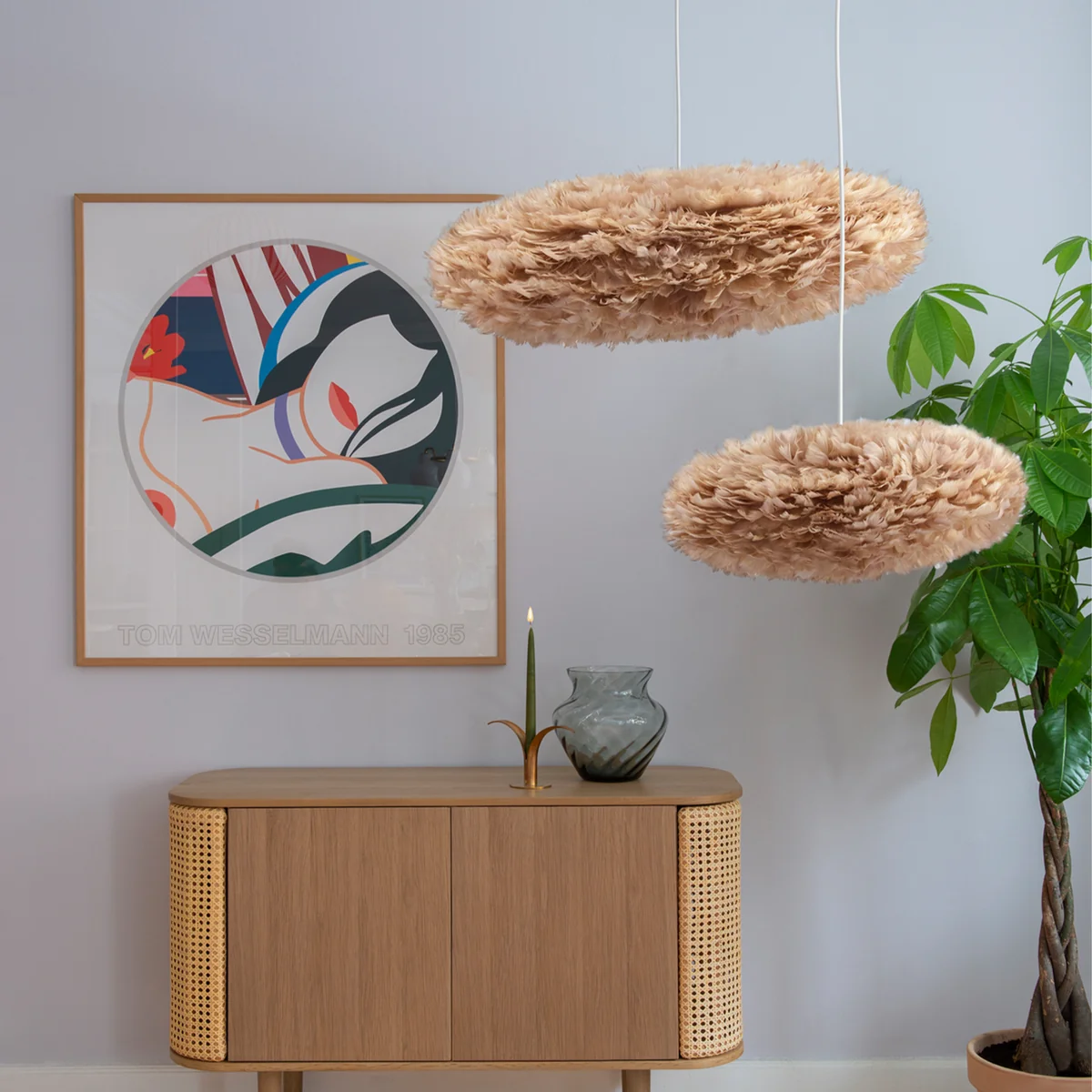 Esther is de naam van de nieuwe vorm van de populaire veerarmatuur van Umage . In ovaal, plat design past de lampenkap ideaal in de bestaande collectie en is daardoor bijzonder geschikt voor lage plafonds of als verlichting boven de eettafel.