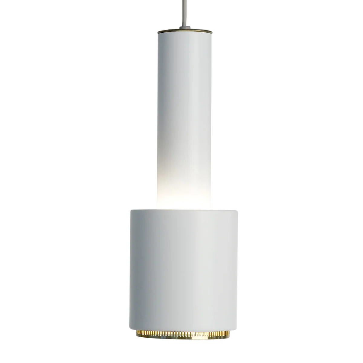 De lamp bestaat uit twee stalen cilinders, de ene in de andere. Op het punt waar de twee cilinders elkaar ontmoeten, wordt het licht naar boven gereflecteerd. Met de geperforeerde, met messing afgewerkte stalen ring heeft de lamp een elegant detail, waardoor het licht kan worden verspreid. De lamp ziet er bijzonder goed uit, alleen of in een groep boven de eettafel.