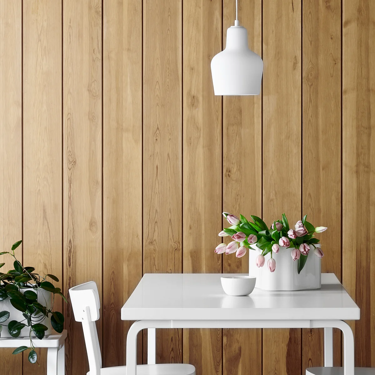 Het licht van de lamp dringt zachtjes door in de zijdematte glazen kap en creëert een aangename sfeer. De kap van de armatuur is open naar de vloer toe, zodat de ruimtes eronder sfeervol worden verlicht.