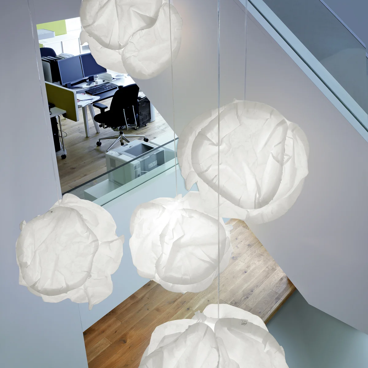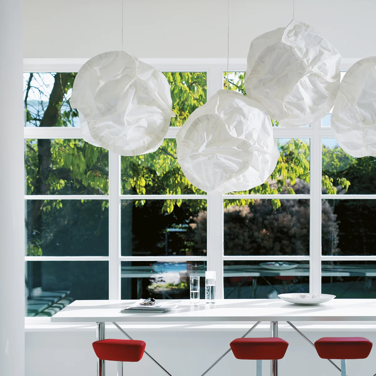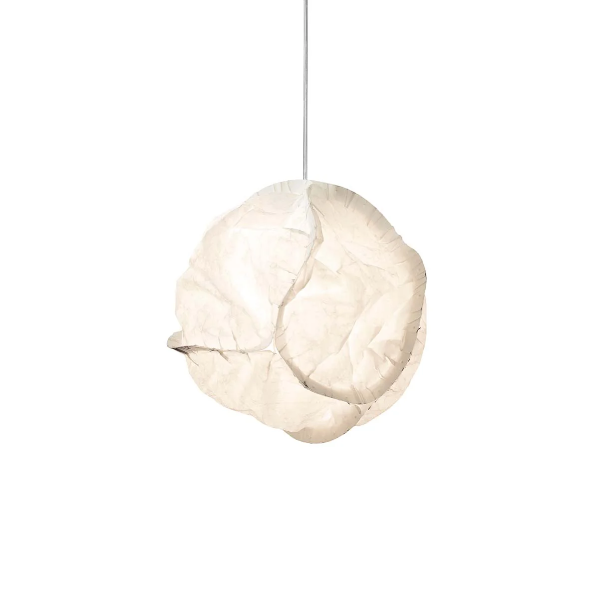 Aangeboden in verschillende maten en uitvoeringen - als hanglamp, staande lamp, staande lamp, vloerlamp of tafellamp - is de gemeenschappelijke eigenschap een volumineuze, maar zachte, papierachtige kap, waarin een onzichtbare gloeilamp in het midden is geplaatst.