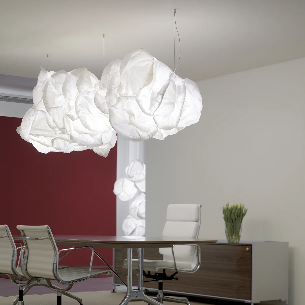 Om verlichtings- en veiligheidsredenen was er echter een alternatief materiaal nodig voor de serieproductie. Na intensief onderzoek werd speciaal voor dit doel polyestervlies gebruikt, dat qua uiterlijk en gevoel vergelijkbaar is met sterk, licht vezelig papier. Flexibel hervormd, scheurvast, scheurvast, vlamvertragend, verouderingsbestendig en eenvoudig te reinigen, is het materiaal een ideale keuze voor CLOUD.