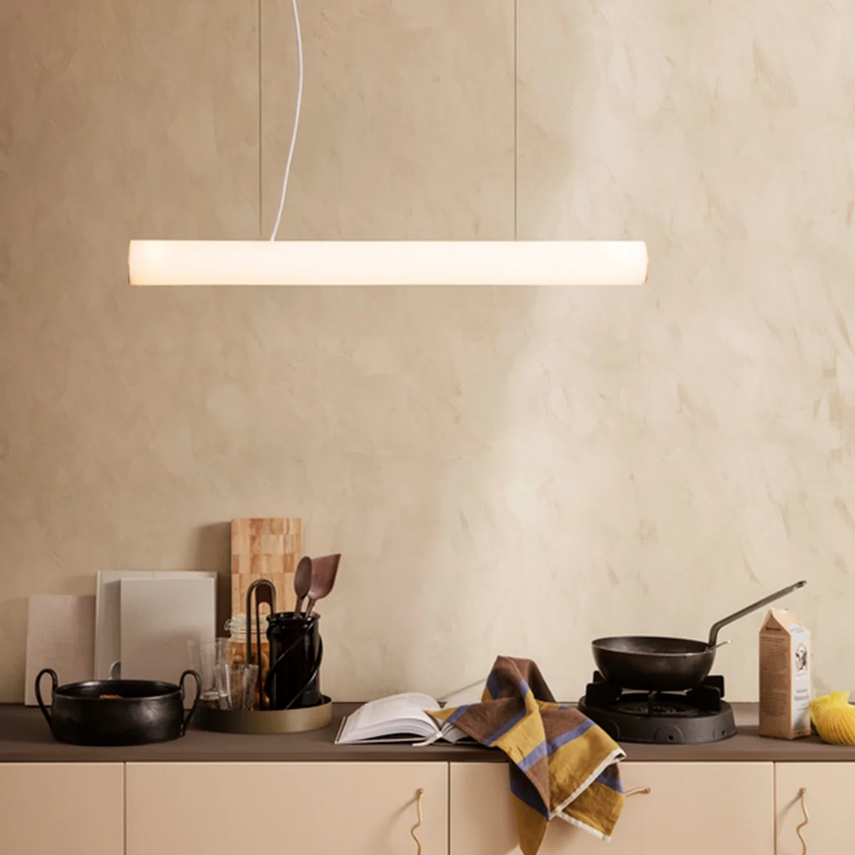 De Vuelta Hanglamp van Ferm Living zorgt voor optimale verlichting in de woonkamer, entree of keuken met een moderne uitstraling. De lamp bestaat uit een cilindervormige buis van mondgeblazen opaalglas, die overtuigt door haar duidelijk geribbelde oppervlak. Dankzij het witte doorschijnende glas geeft de LED-lamp een zacht licht dat met behulp van een dimmerafstandsbediening kan worden aangepast aan de stemming. De hanglamp kan alleen of kunstig in een groep worden opgesteld. Zo kunnen bijvoorbeeld meerdere lampen worden opgesteld om een lange tafel in de eetkamer te verlichten. Vuelta lampen kunnen in een rij worden geplaatst.
