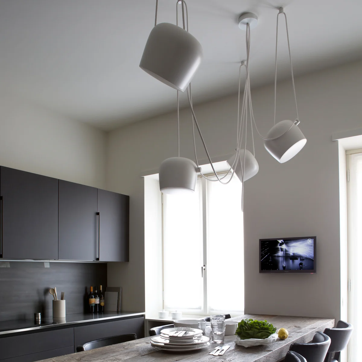 Flos vervaardigt de AIM van gepolijst aluminium, ABS en polycarbonaat. Dankzij de dimbare LED's is de AIM pendelarmatuur energiebesparend en kan ze verschillende lichtstemmingen in de ruimte creëren, terwijl de 9 meter lange kabel elke ophangvariant mogelijk maakt.