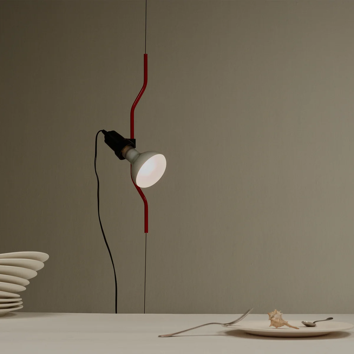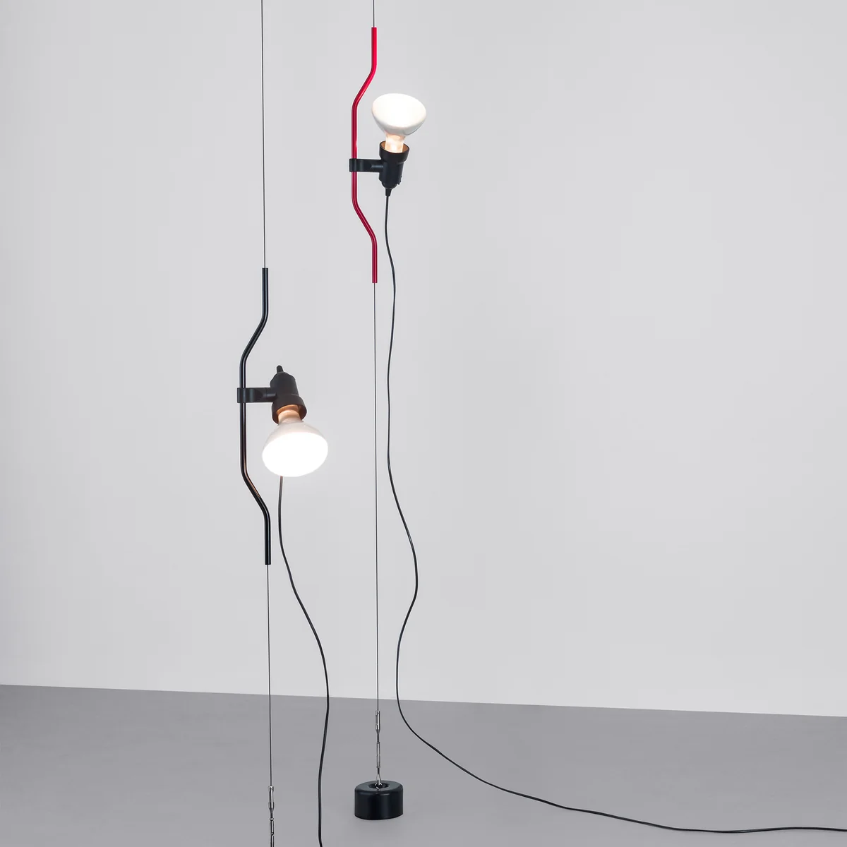 Hoogteverstelling van het armatuurlichaam mogelijk door een gegoten, vloeibaar gecoate (zwart, wit, rood) of vernikkelde stalen buis op een staalkabel te schuiven, die op volledige kamerhoogte van het plafond naar de vloer wordt gespannen (nuttige lengte: 400 centimeter).