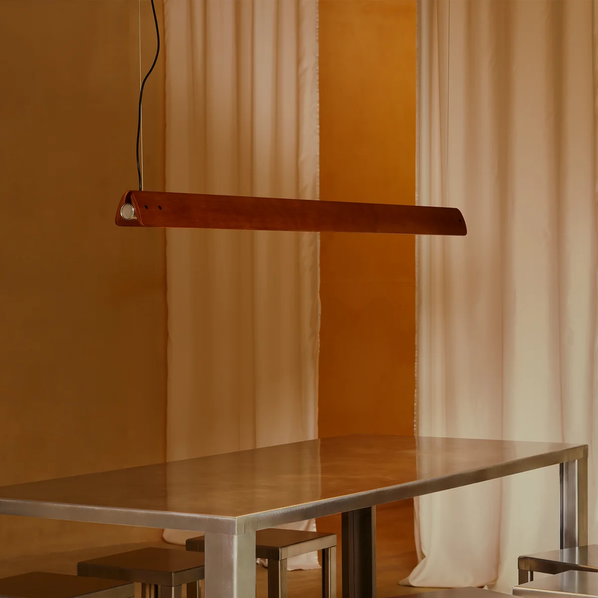 De Seki-Han hanglamp, ontworpen door Tobia Scarpa, is een heruitgave van zijn iconische ontwerp uit 1963 - een meesterwerk dat vakmanschap in hout, techniek en lichtpoëzie combineert. Twee horizontale vleugels van essenhout, verbonden door verchroomde metalen fittingen, omlijsten een centrale, buisvormige lichtbron die zowel direct als indirect licht produceert. Door de houten vleugels te draaien kan de lichtuitstraling symmetrisch of asymmetrisch worden geregeld - een subtiel, sculpturaal gebaar dat de kamer in beweging zet.