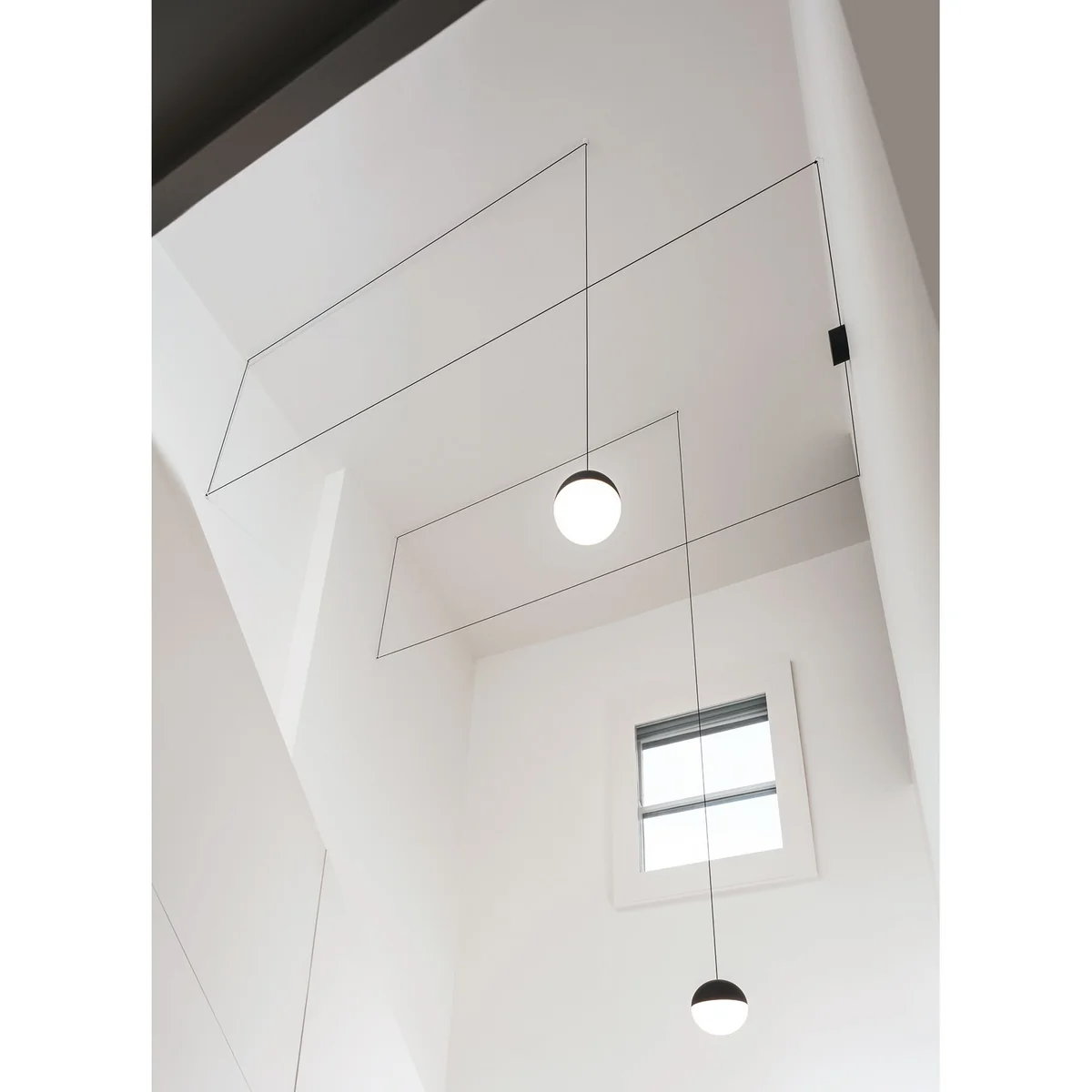 Uitgerust met een 12 meter lange kabel maakt de pendelarmatuur Flos String Light het mogelijk om geometrische patronen in de ruimte te tekenen. Kamers krijgen nieuwe architectonische dimensies. Indien nodig kunnen de kabels herschikt worden om een nieuwe sfeer in de kamer te creëren, patronen van duidelijke lineariteit tot abstracte kunst zijn mogelijk.