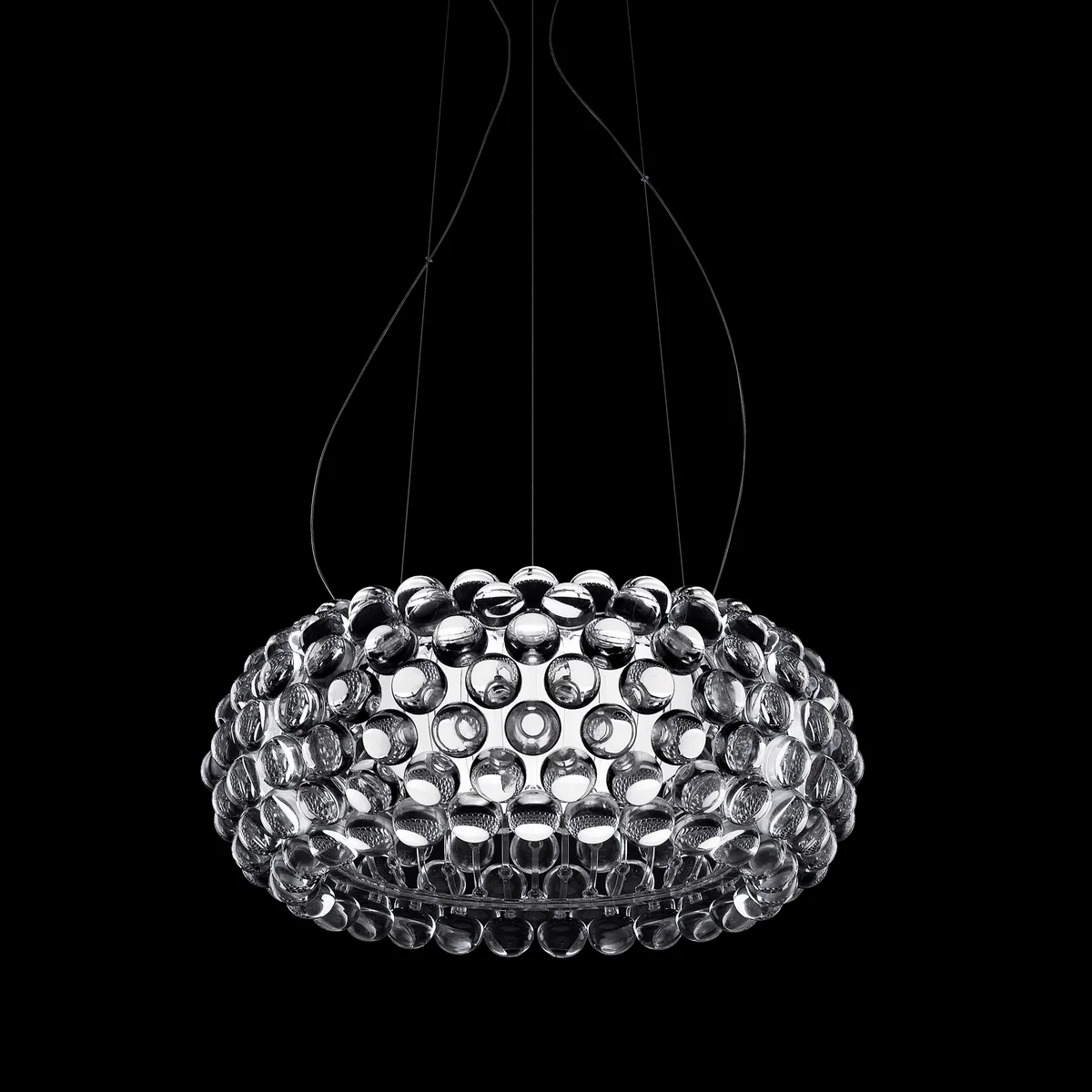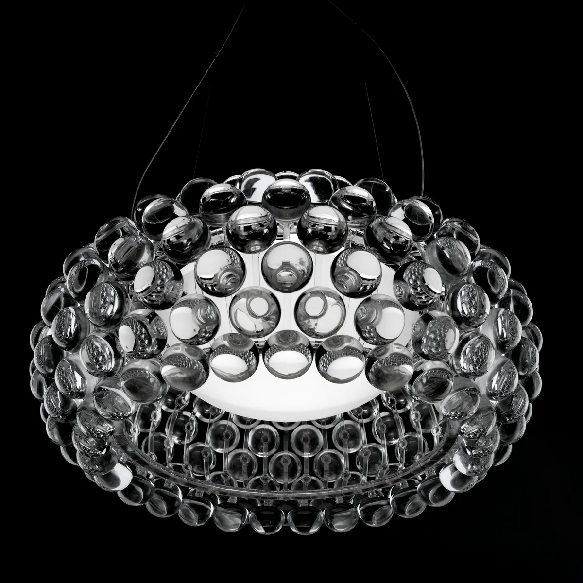 Een juweel van creativiteit, maar ook van technologie. Met een enkel, bolvormig element en een modulaire, boogvormige structuur kan een hele collectie modellen worden gemaakt. Wanneer u de Foscarini Caboche inschakelt, dringt het licht van binnenuit door in de vrije ruimten tussen de transparante bollen en wordt het er tegelijkertijd door verspreid, als door vele lichtgevende kristallen. Zijn dat diamanten? Nee, dat is plexiglas. De structuur en de bollen veranderen het oorspronkelijke idee van Patricia en Eliana in een pure vorm van licht die een andere uitdrukking krijgt, afhankelijk van het gezichtspunt van waaruit je ernaar kijkt. Elke bol confronteert het licht op een andere manier en geeft het op de meest originele manier weer, zodat het zelf een bron van licht wordt.