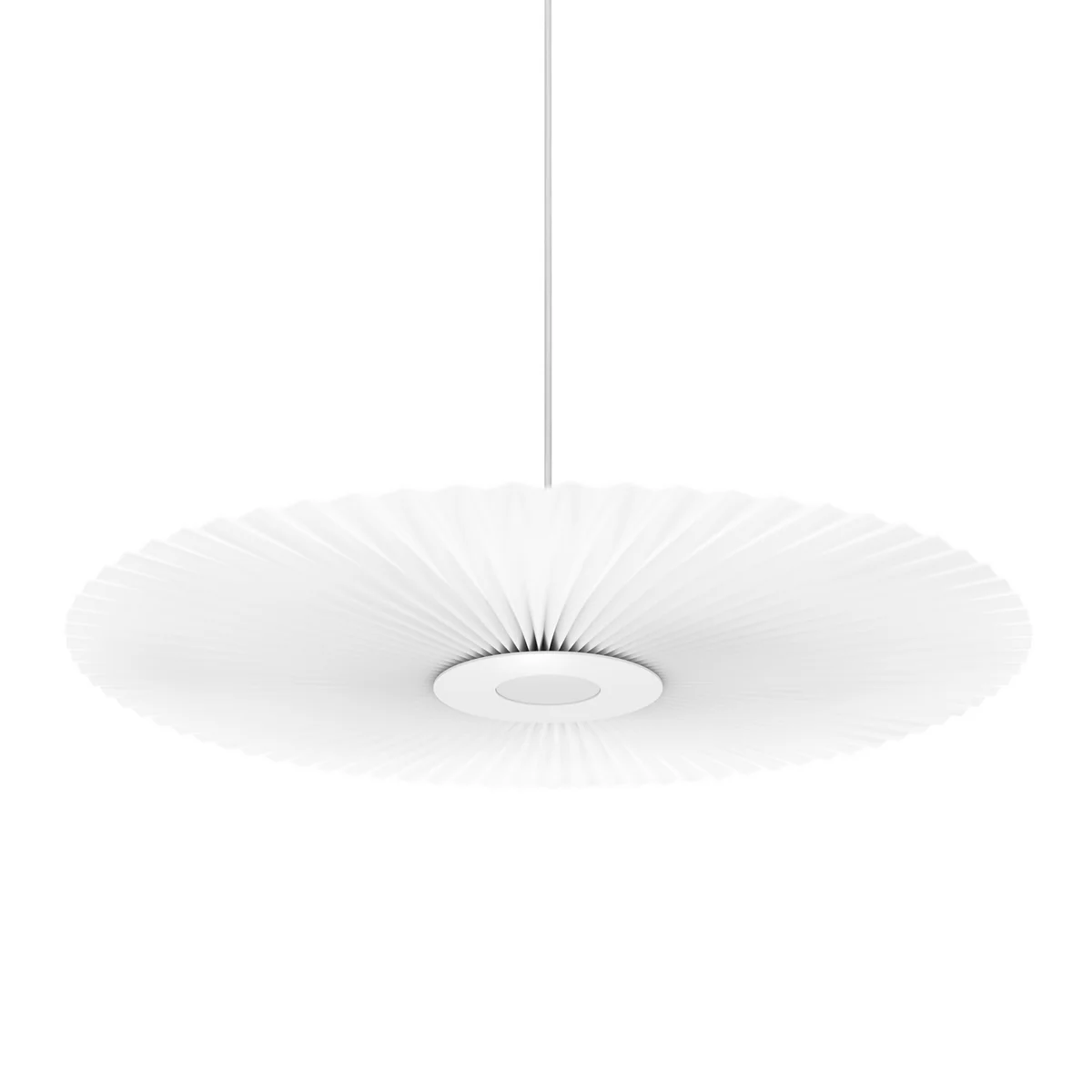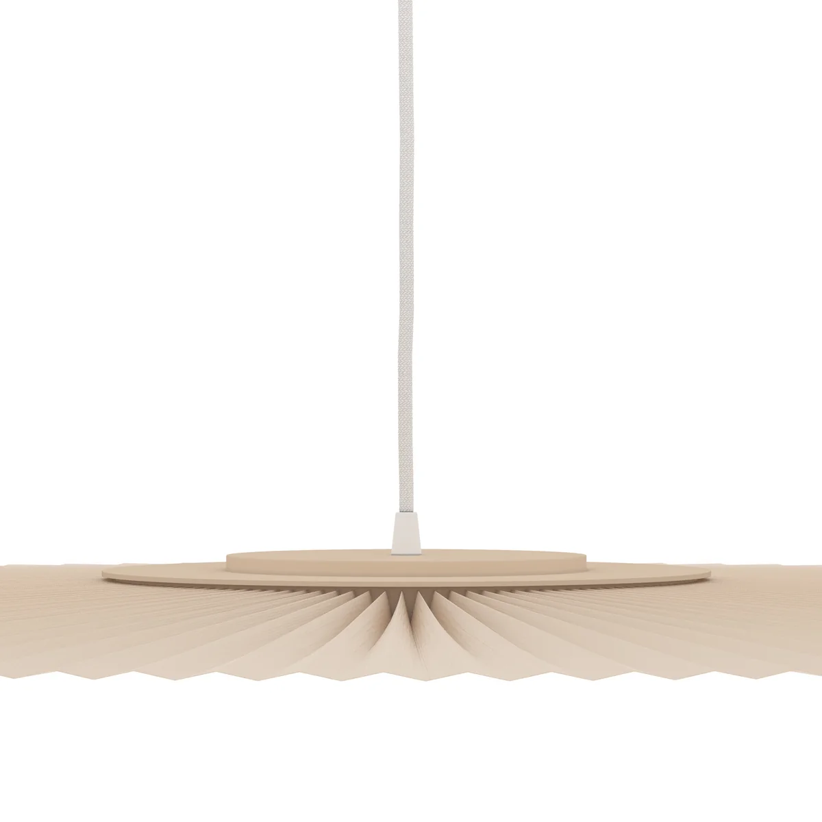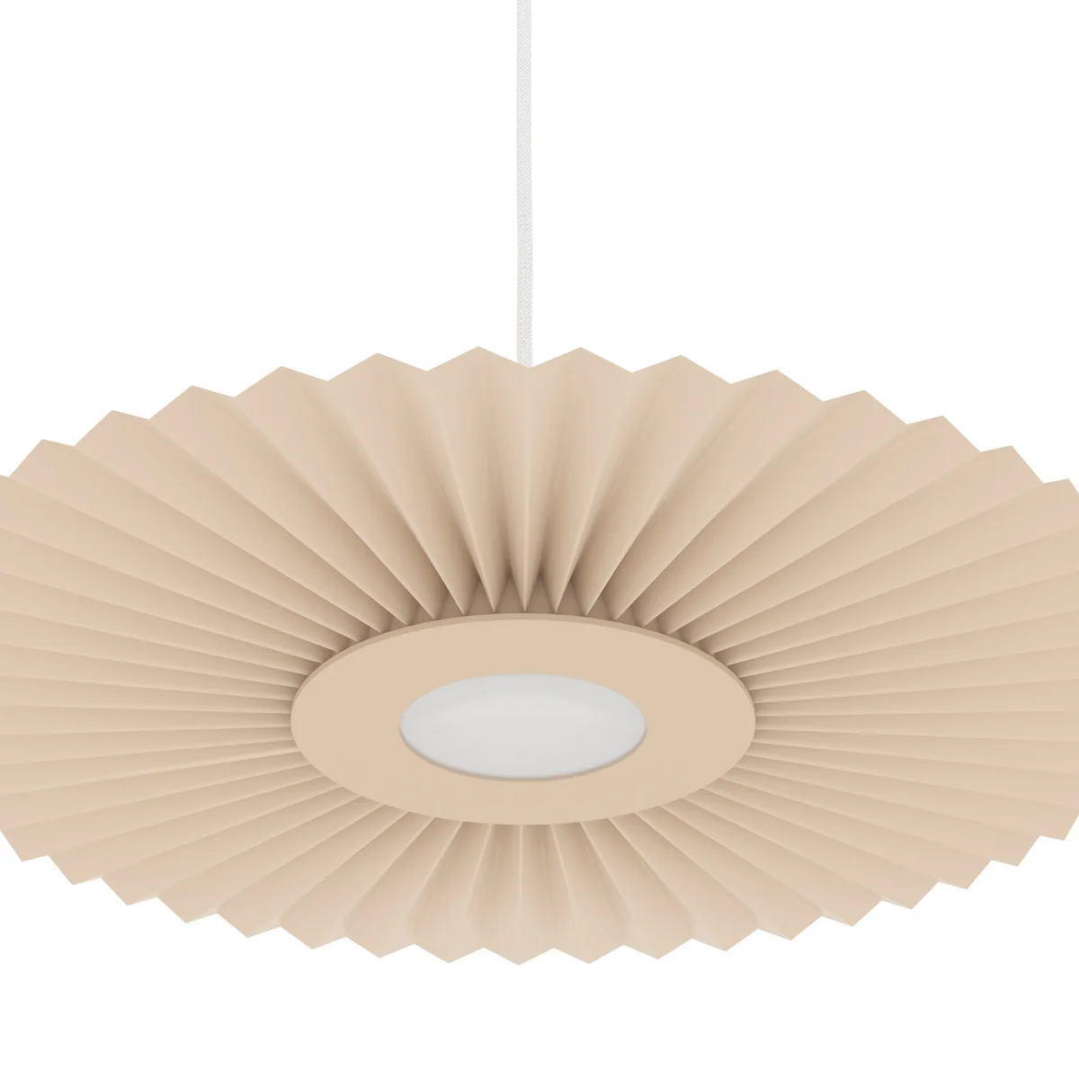 Hartô De Carmen LED hanglamp van wordt gekenmerkt door haar plaatvormige geplooide kap, die er tegelijkertijd elegant en een beetje speels uitziet. De kap is gemaakt van PES-stof, d.w.z. 100% polyester met een PVC-coating. Het materiaal is nauwkeurig gevouwen en binnenin voorzien van een LED-lampje en een diffusorschijf. De plooien die uit het midden komen, lijken op zonnestralen die zachtjes worden verlicht door het LED-lampje.